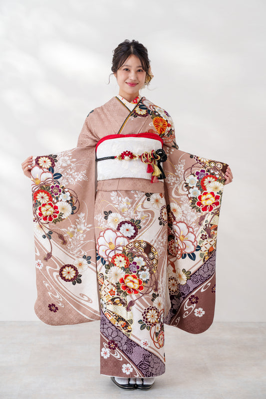 売り切れベージュ地 牡丹 正絹振袖【625】