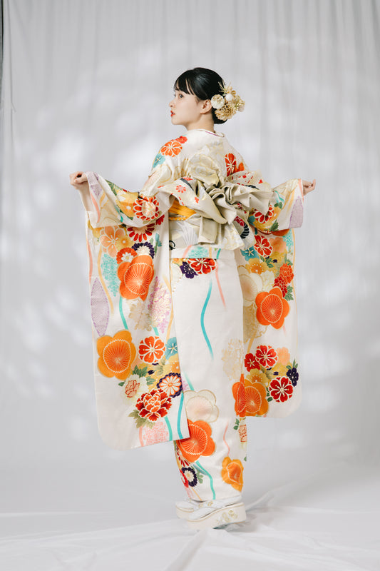 クリーム地 梅 毬 正絹振袖【734】