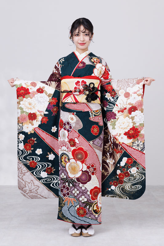 深緑地 レトロ梅柄 正絹振袖【333】