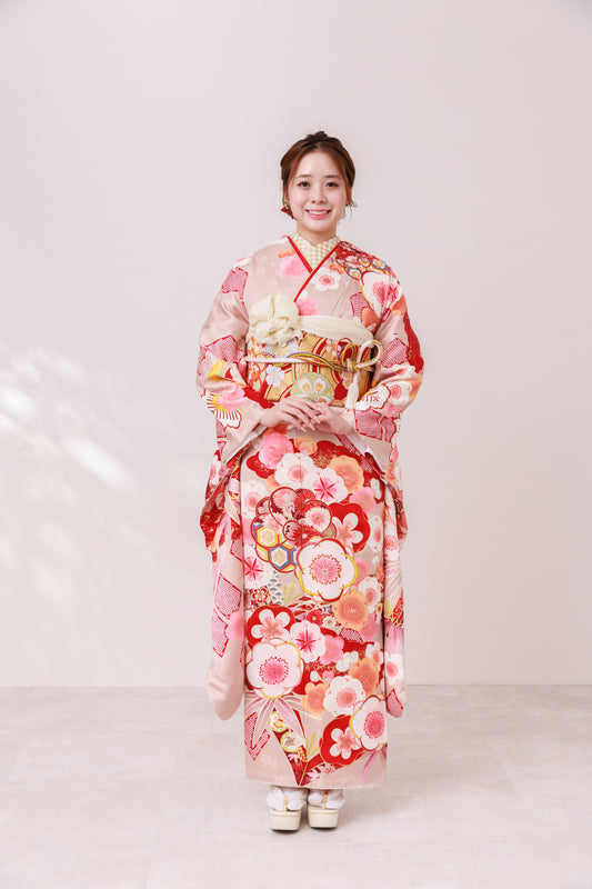くすみピンク地 梅柄 正絹振袖【217】