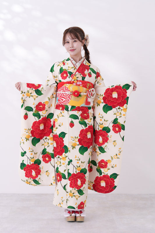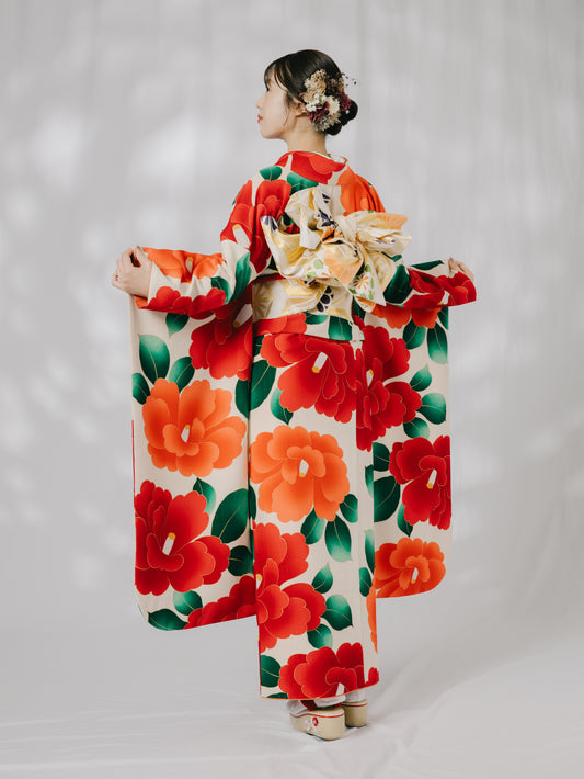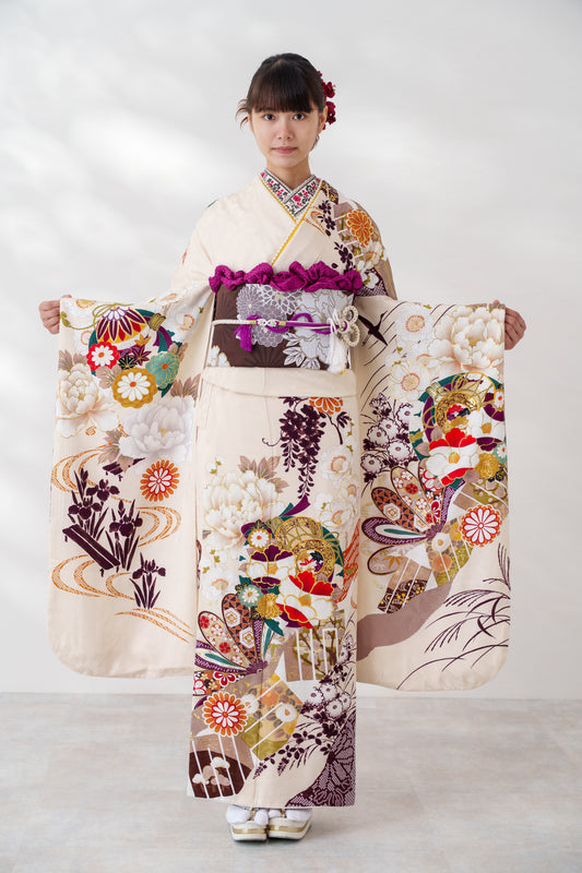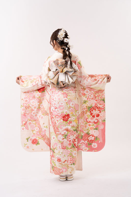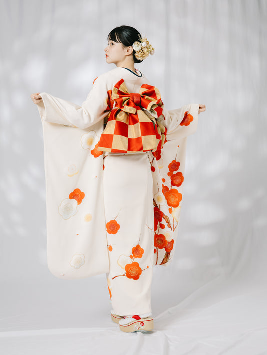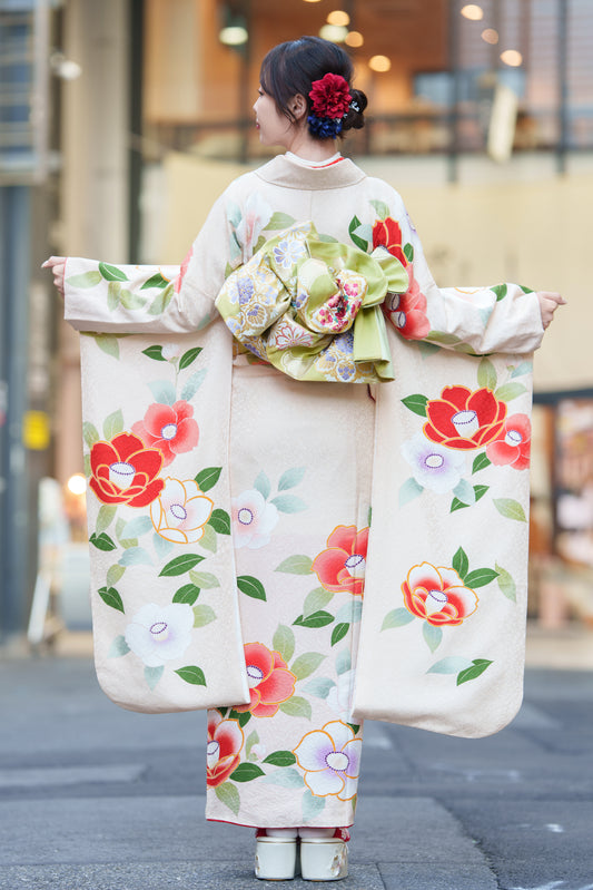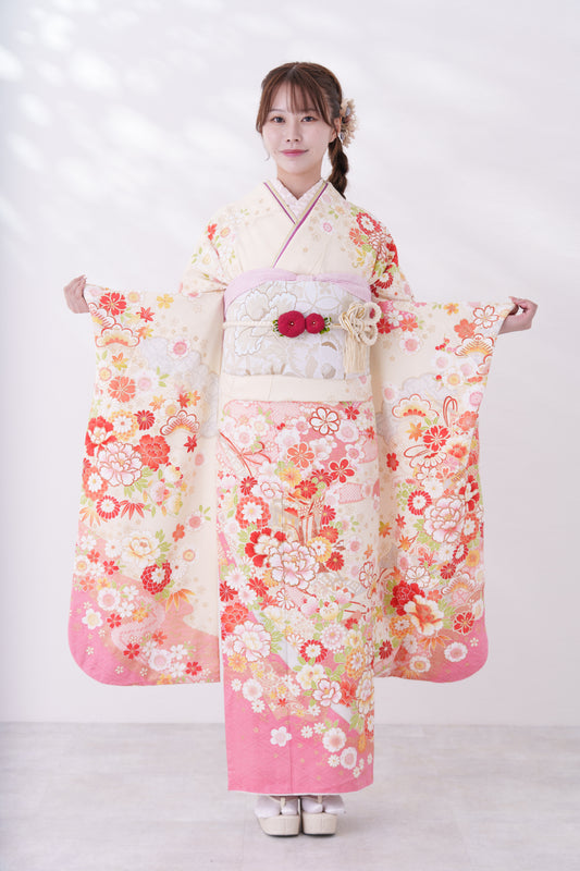 クリーム地 オレンジ鹿の子柄 正絹振袖【258】