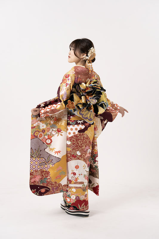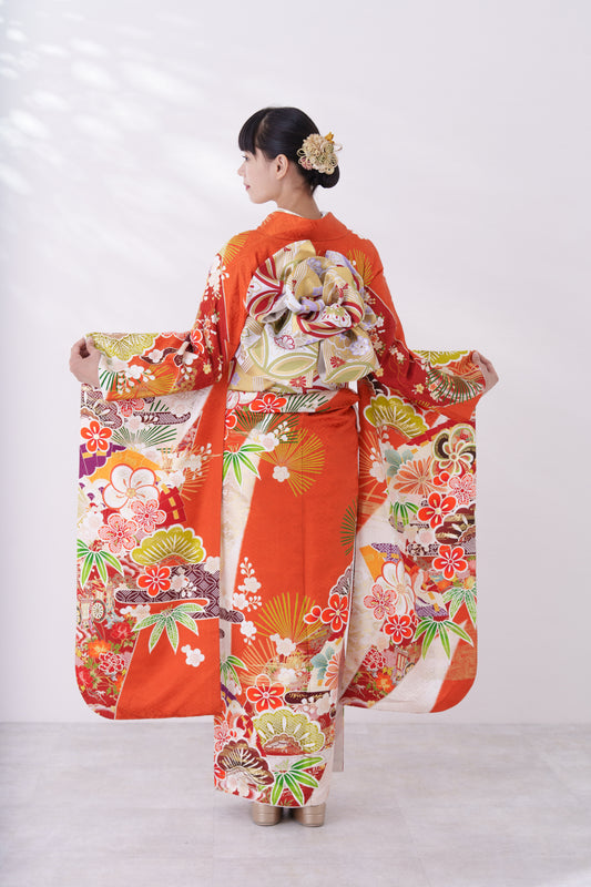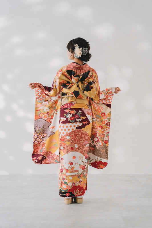 売り切れオレンジ絞り 菊 正絹振袖【500】