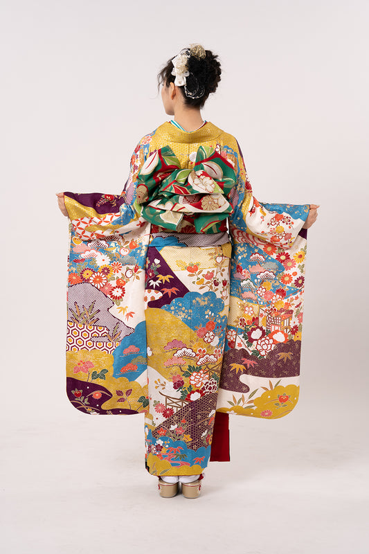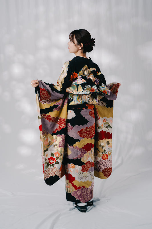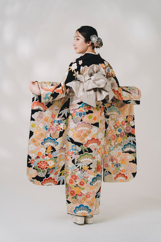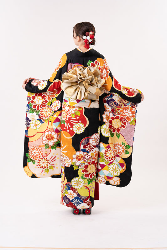 売り切れ黒地 カラフル花々 正絹振袖【296】