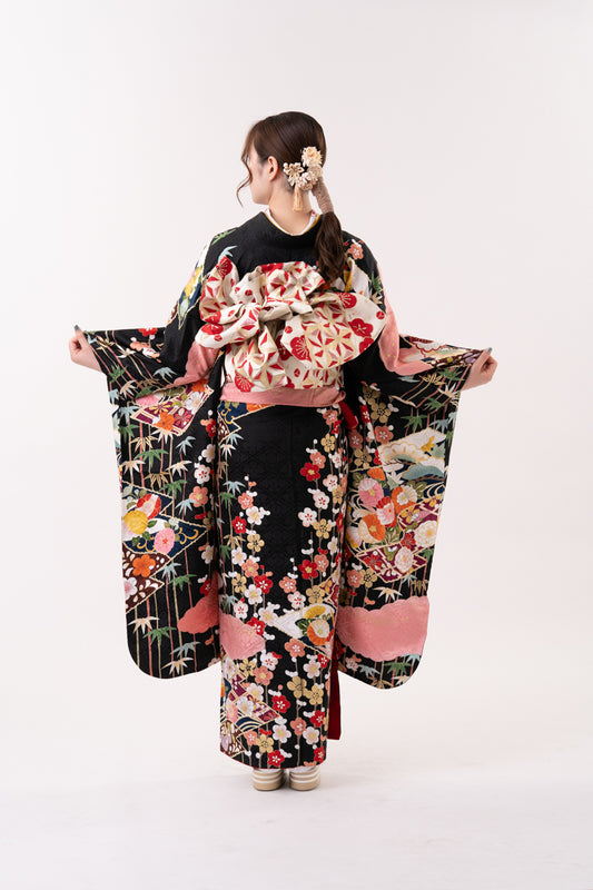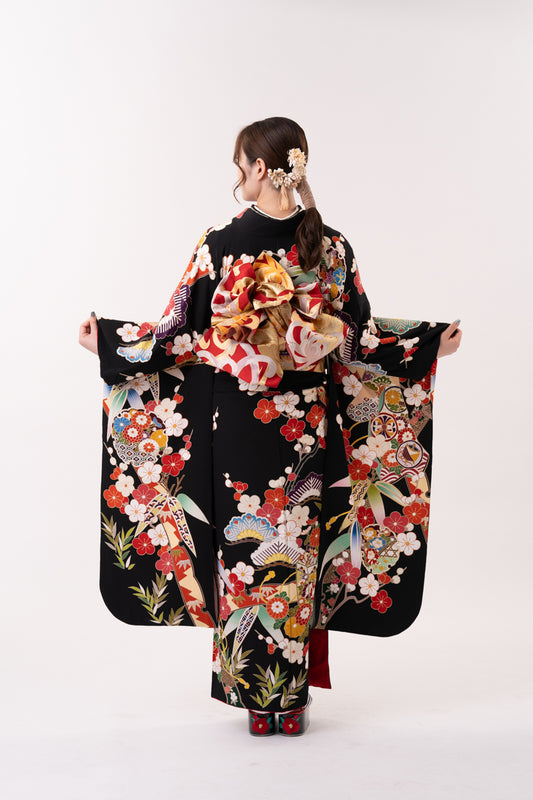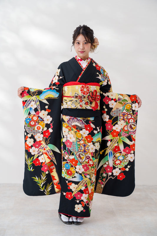 売り切れ黒地 松竹梅柄 正絹振袖【7-20】