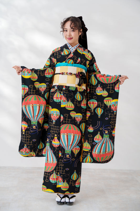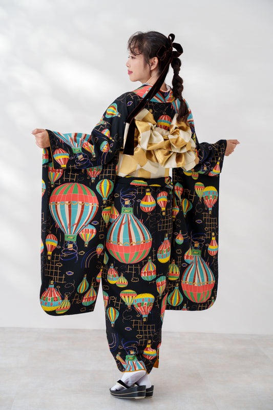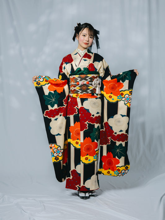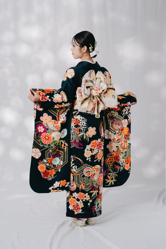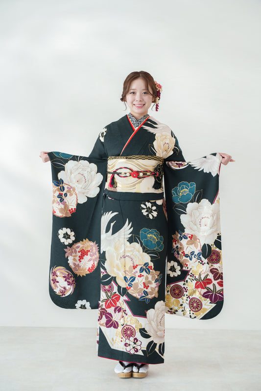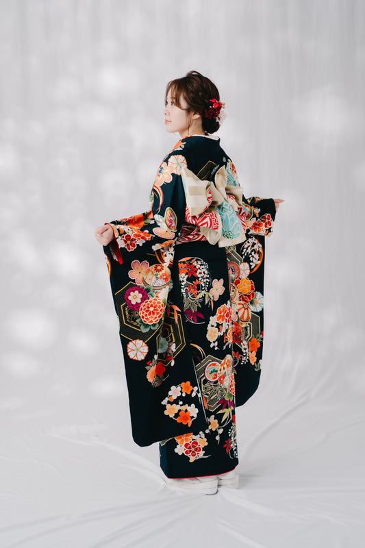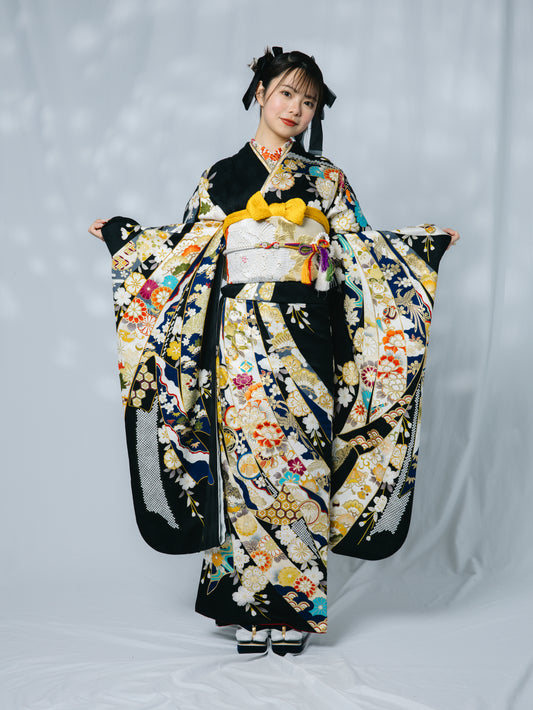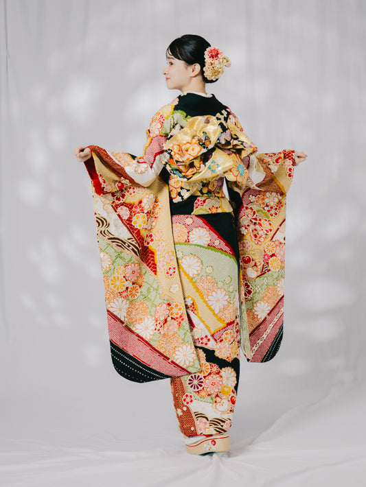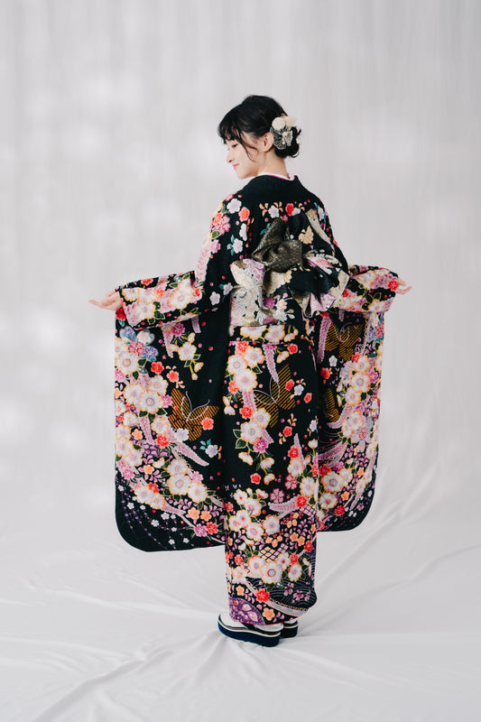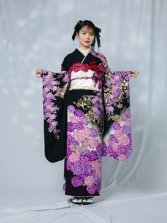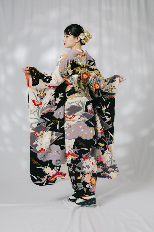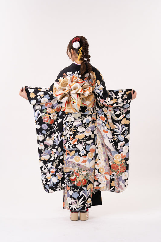 売り切れ黒地 百合紋様 無地振袖【8-19】