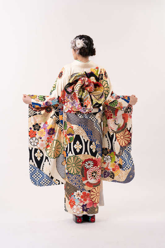 売り切れクリーム色 古典柄 正絹振袖【359】