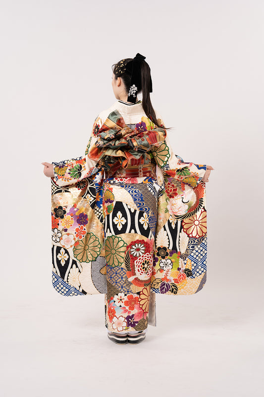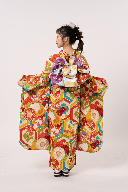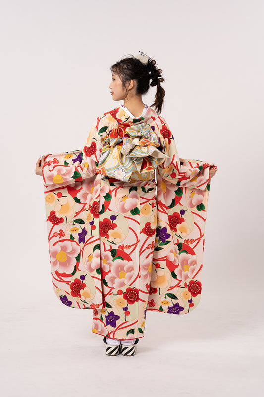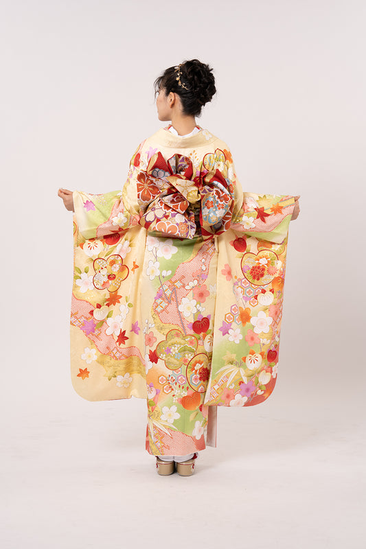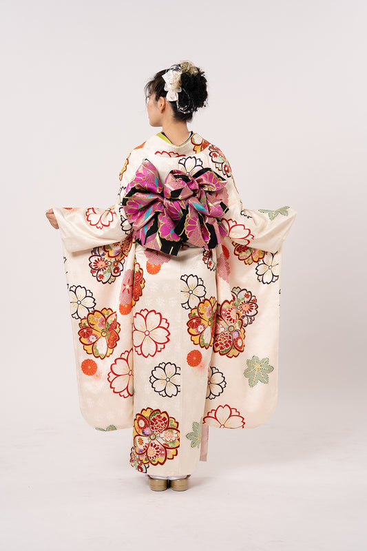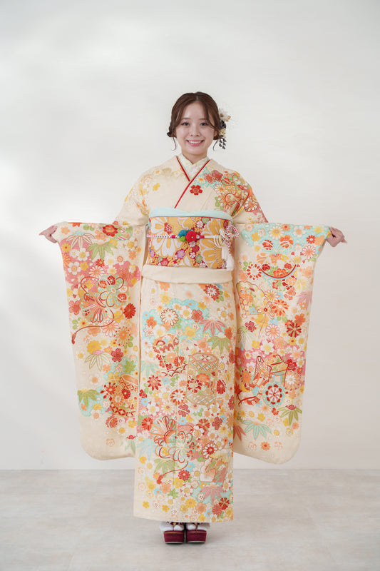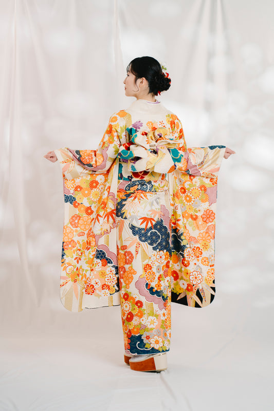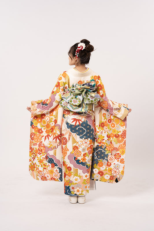 売り切れクリーム色オレンジ花 振袖 【8-18】
