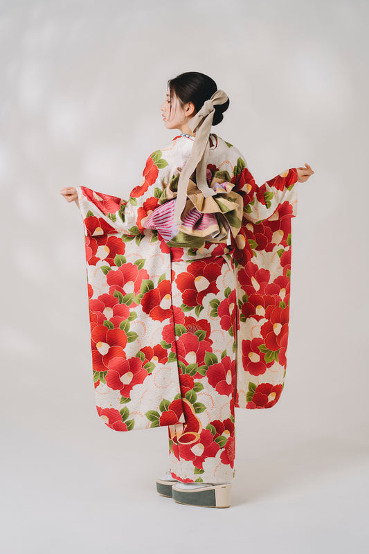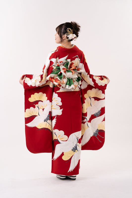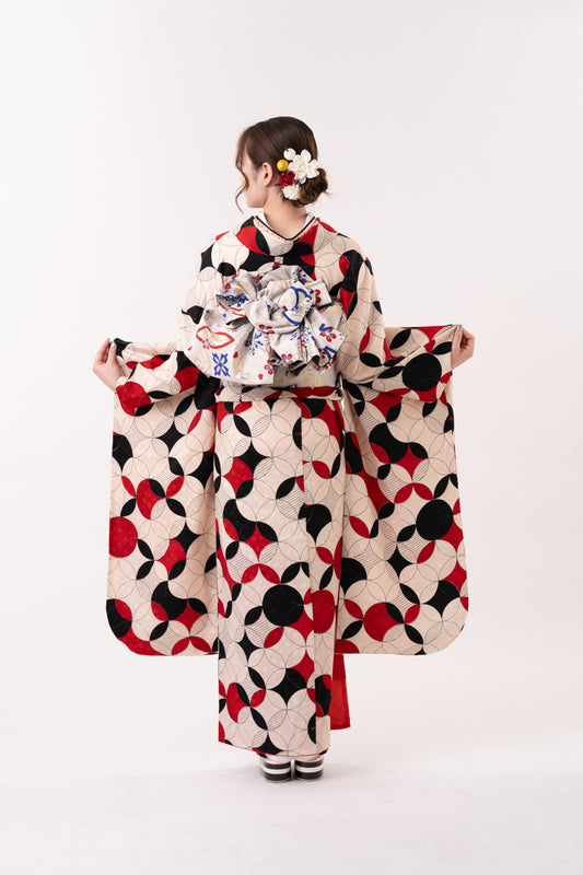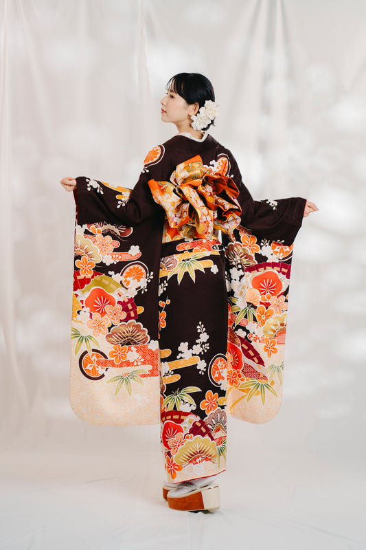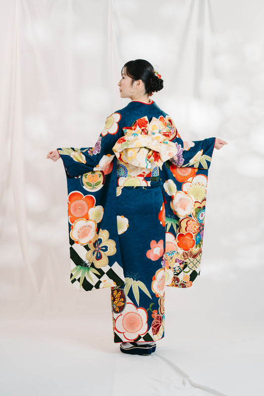 濃紺色 レトロ古典柄 正絹振袖【167】