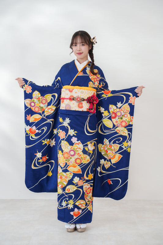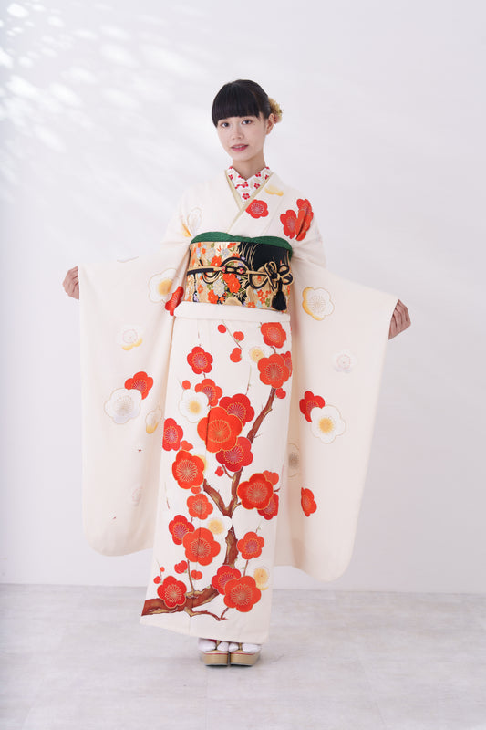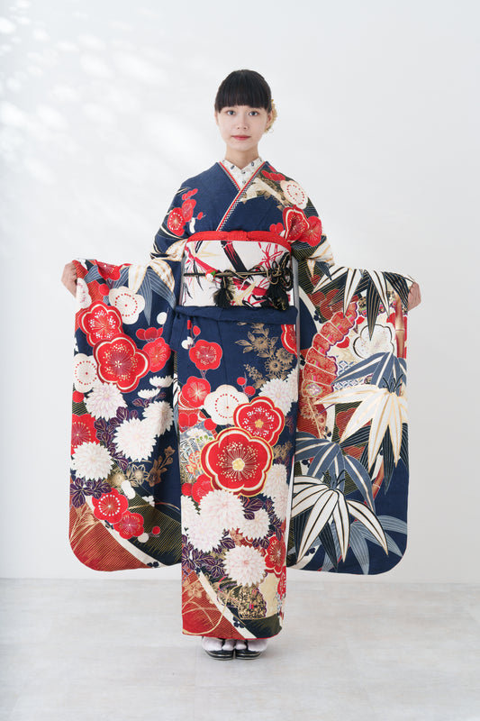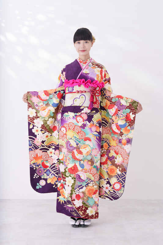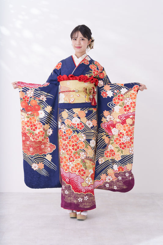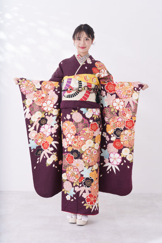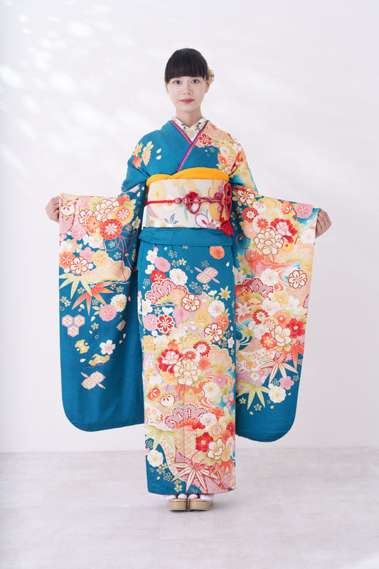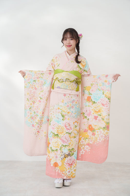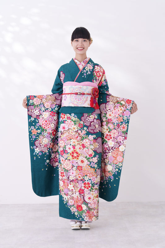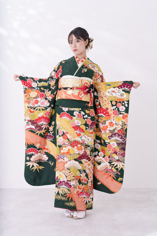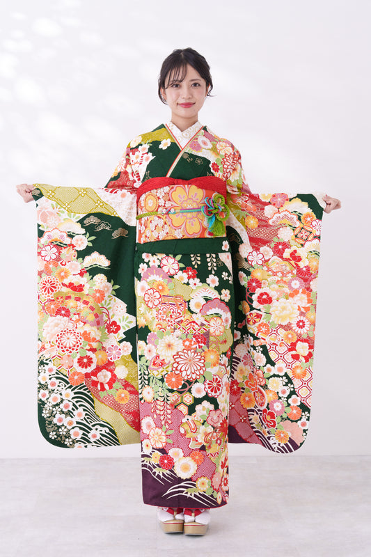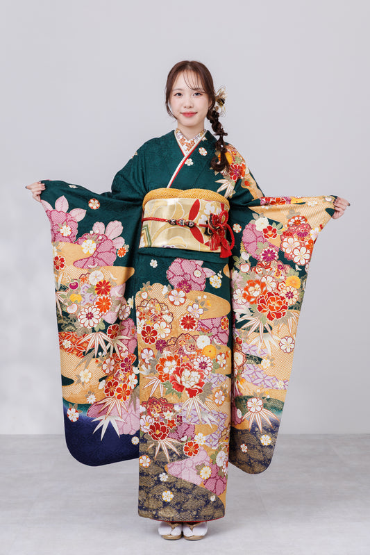 緑地 牡丹・桜・菊 正絹振袖【812】