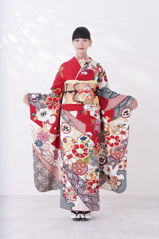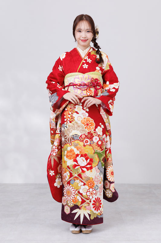 赤地 牡丹 雪輪柄 正絹振袖【810】