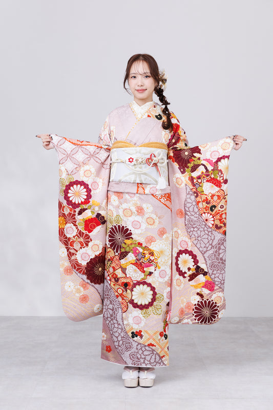 くすみピンク 丸菊 古典 正絹振袖【814】