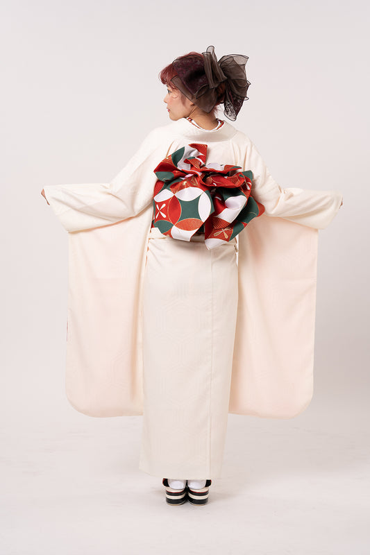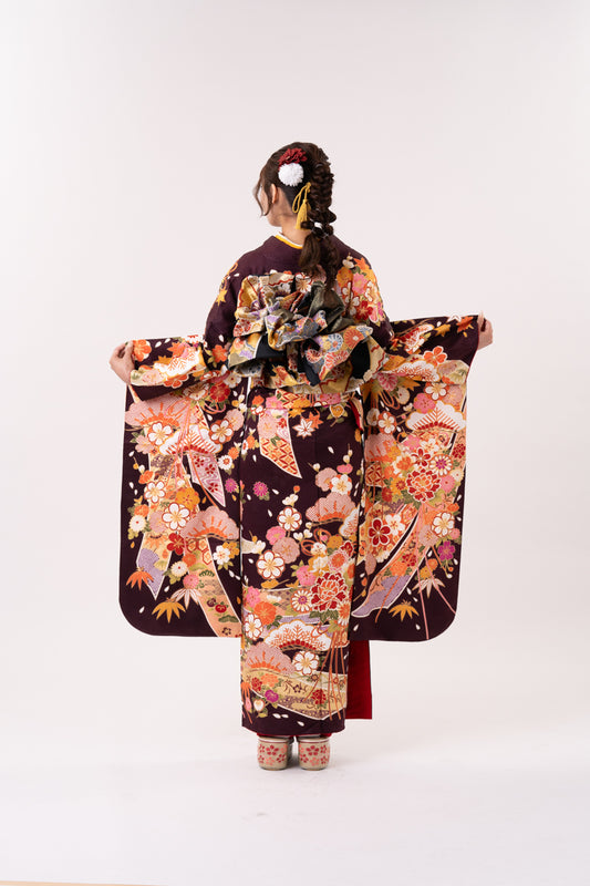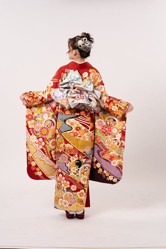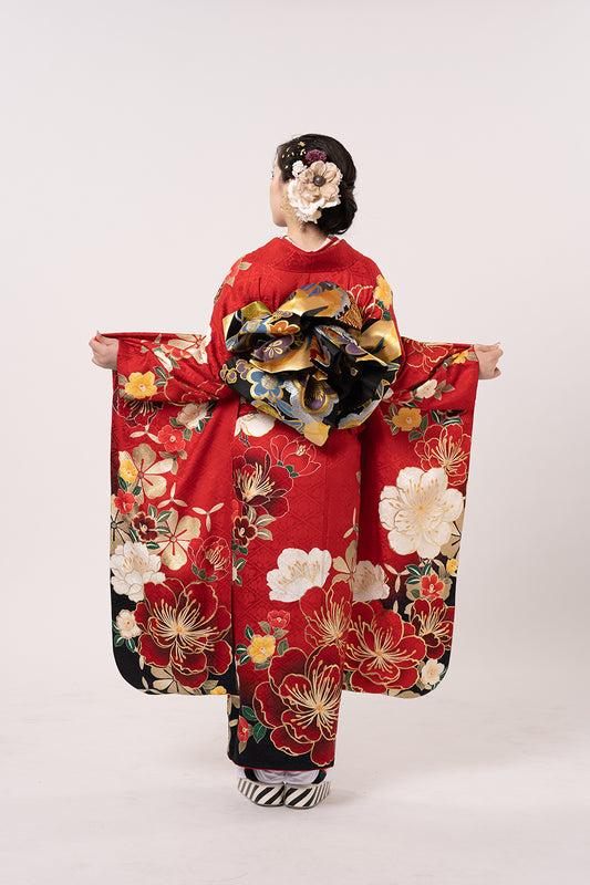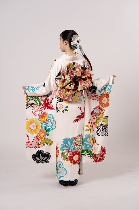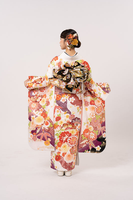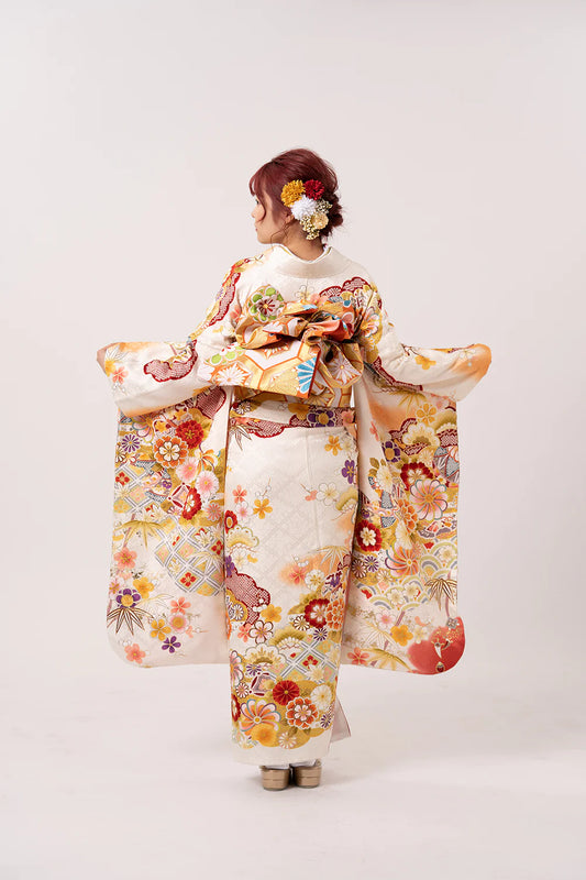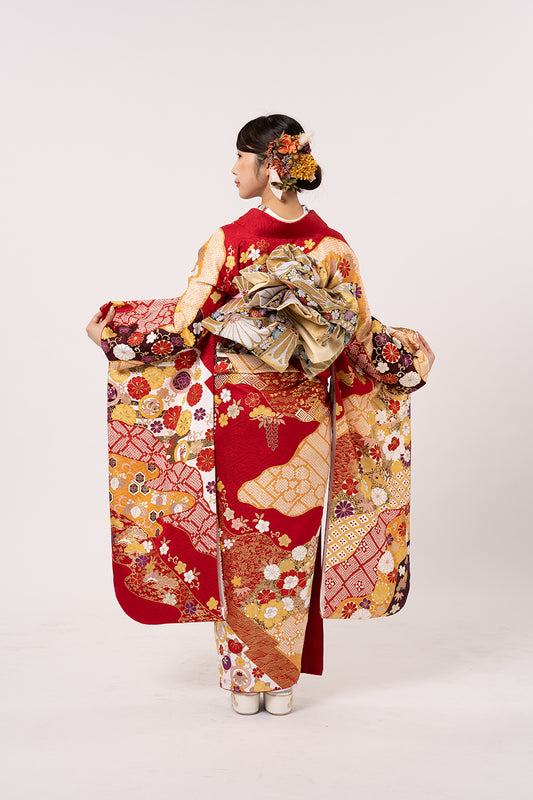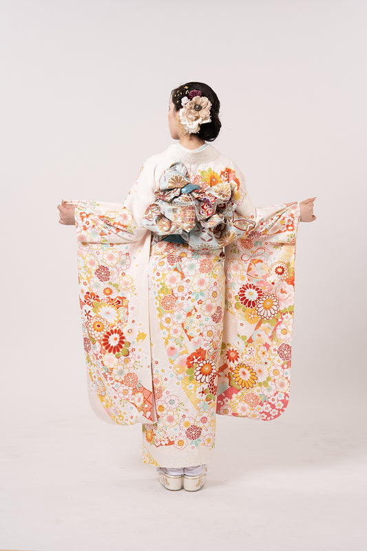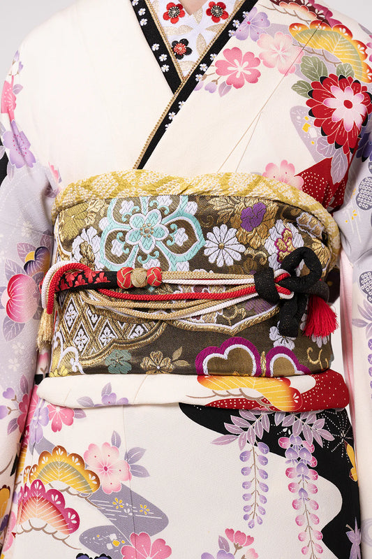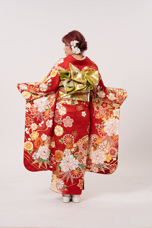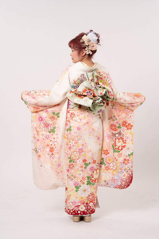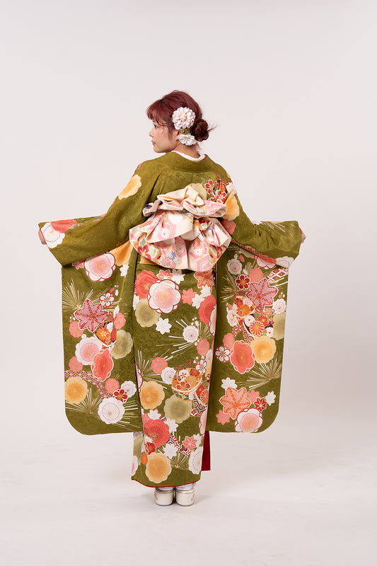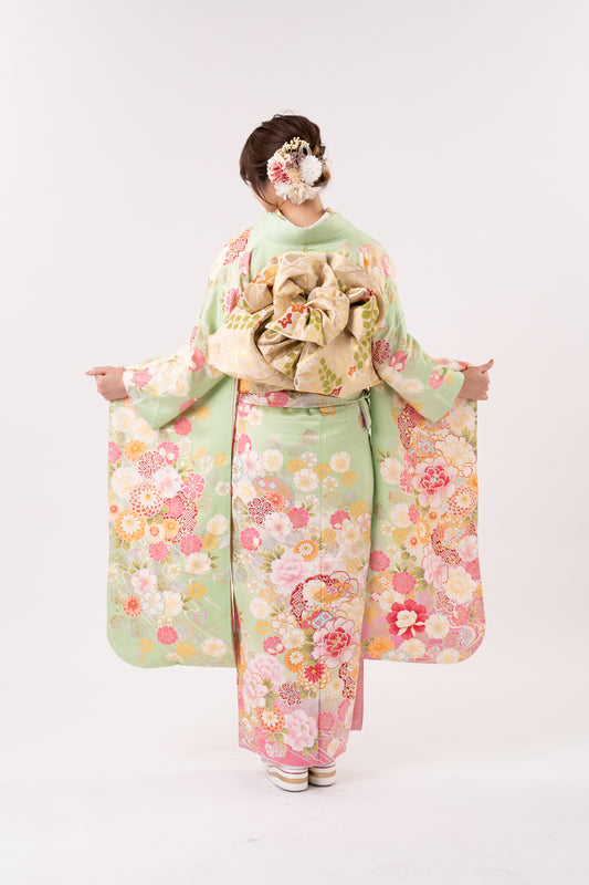 黄緑地 牡丹裾ピンク 正絹振袖【109】