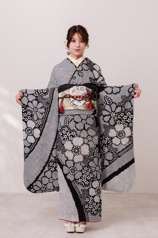 黒地 総鹿の子柄 桜 正絹振袖【885】