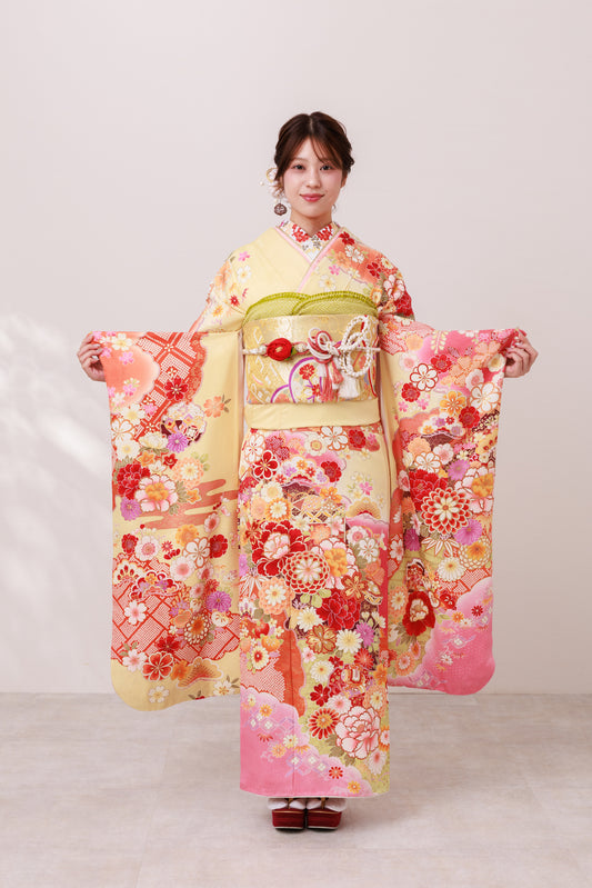 クリーム地 ピンクぼかし 牡丹・丸菊・貝桶 正絹振袖【871】