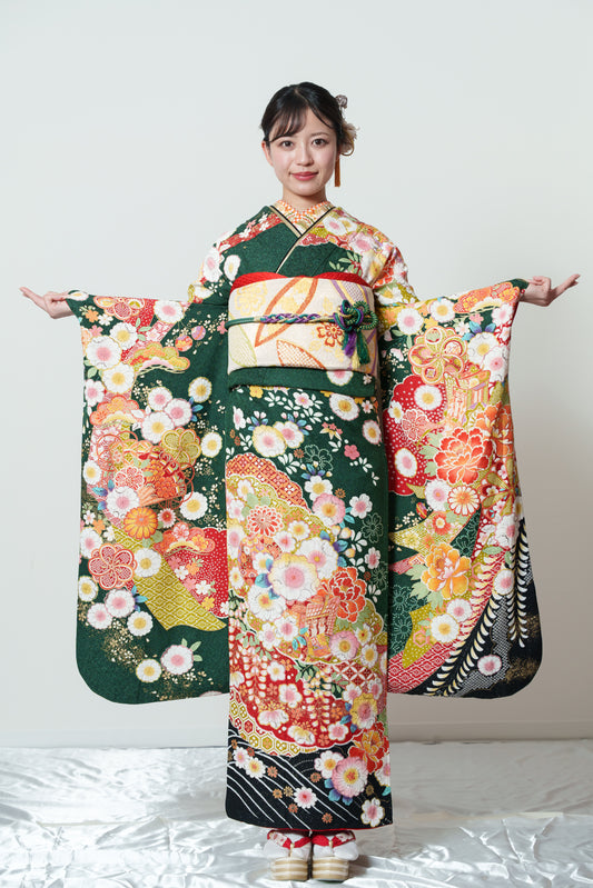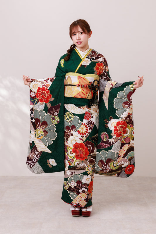 緑地 赤白牡丹・桜 正絹振袖【820】