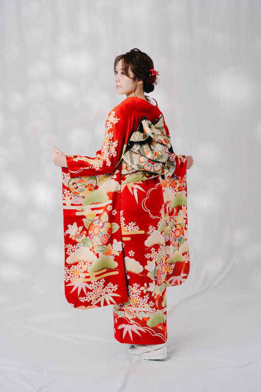 赤地 松竹橘 正絹振袖【466】