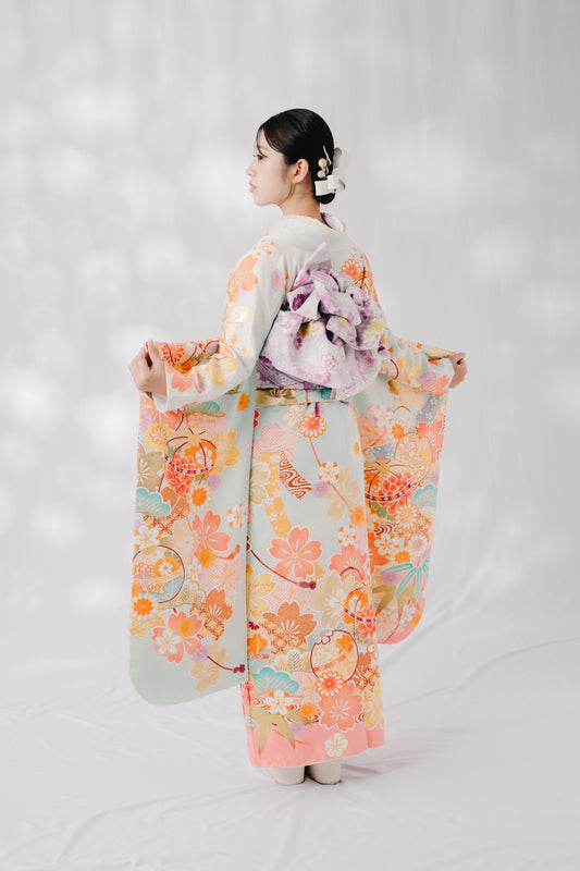 淡水色 菊 正絹振袖【383】