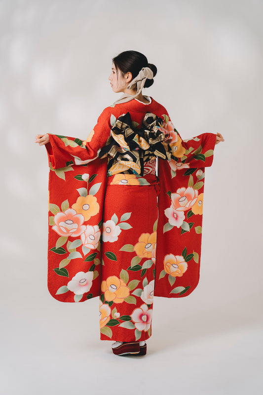 赤地 椿柄 正絹振袖【282】