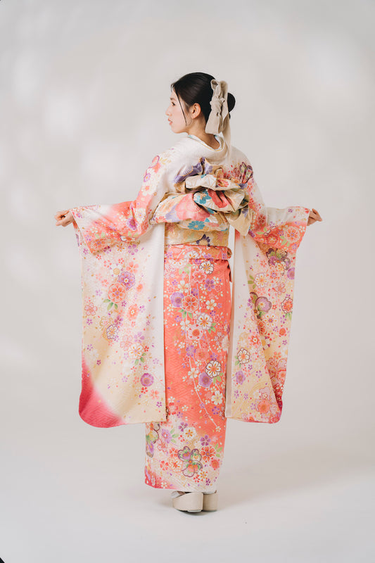 白地 ピンク花柄 正絹振袖【290】