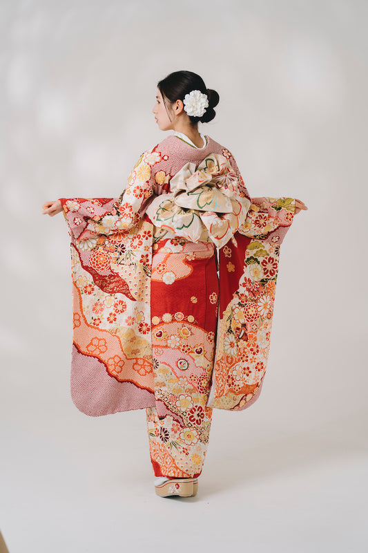 赤地 絞り 正絹振袖【293】
