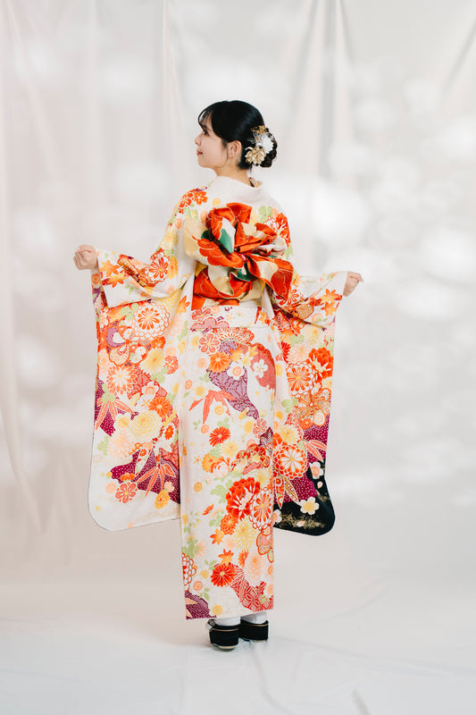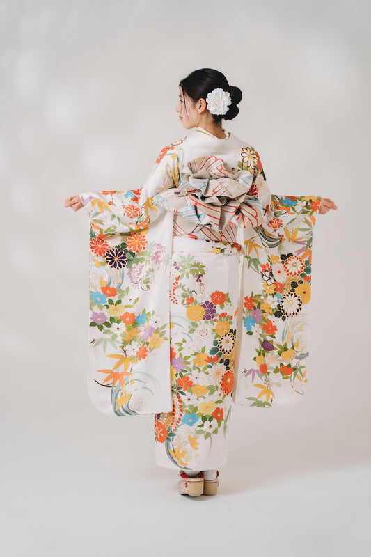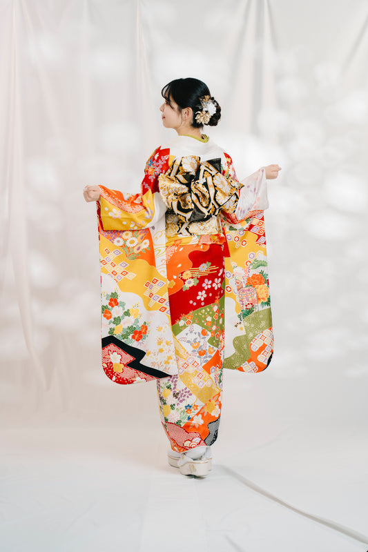 白地 古典柄 正絹振袖【352】