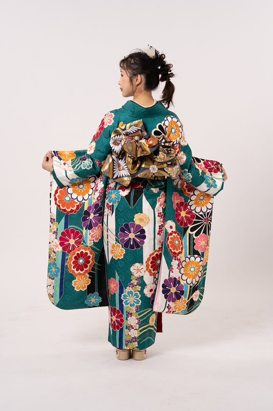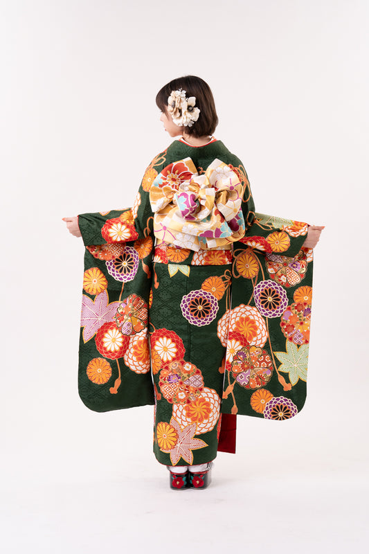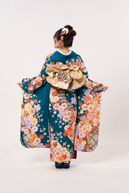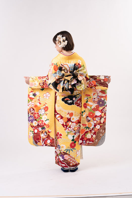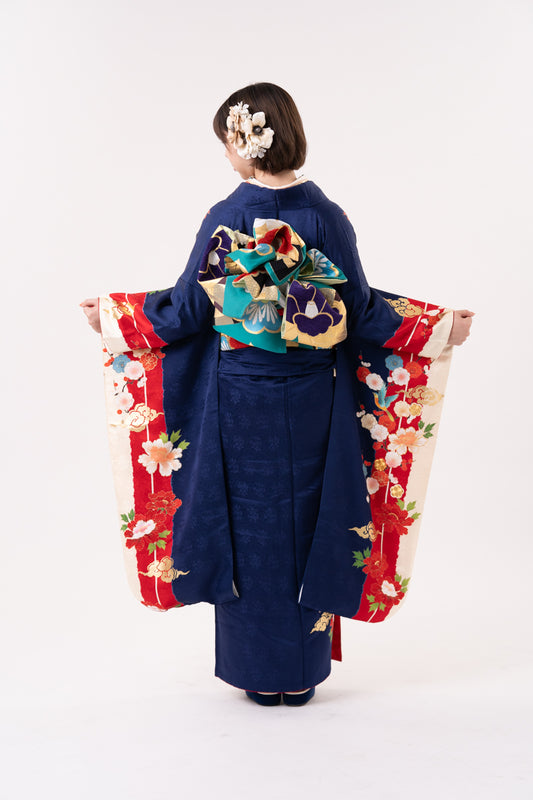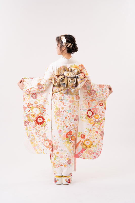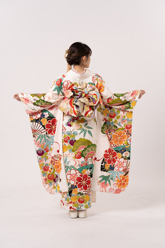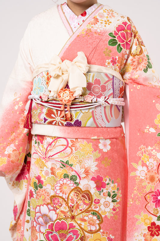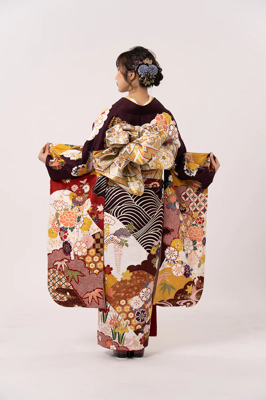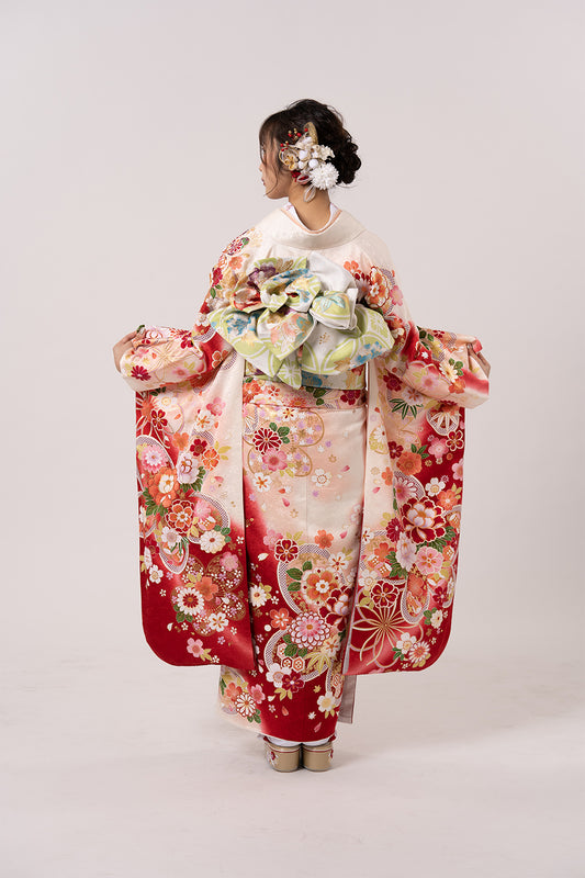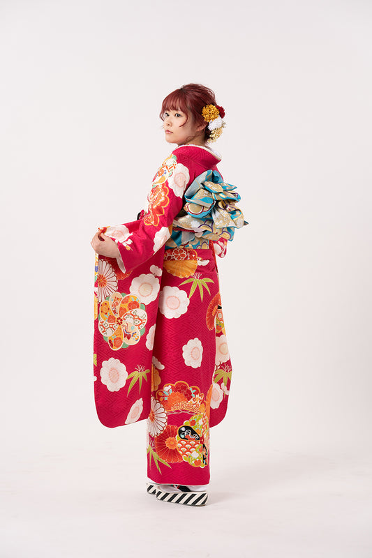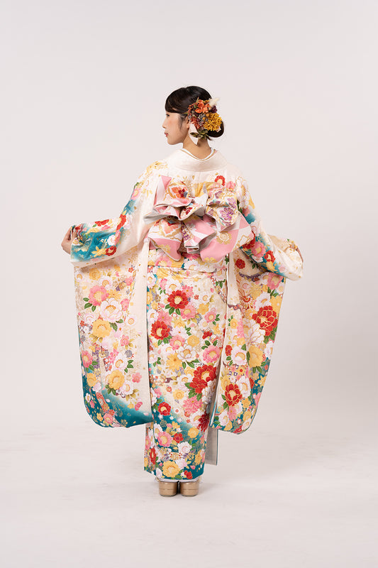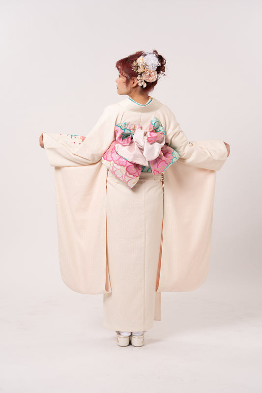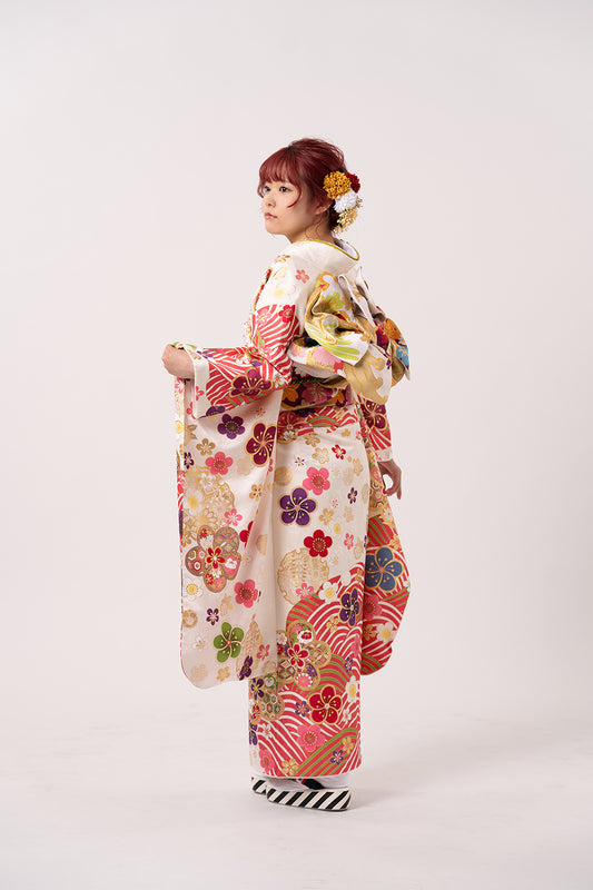 ピンクグレー地 梅尽くし 正絹振袖【112】