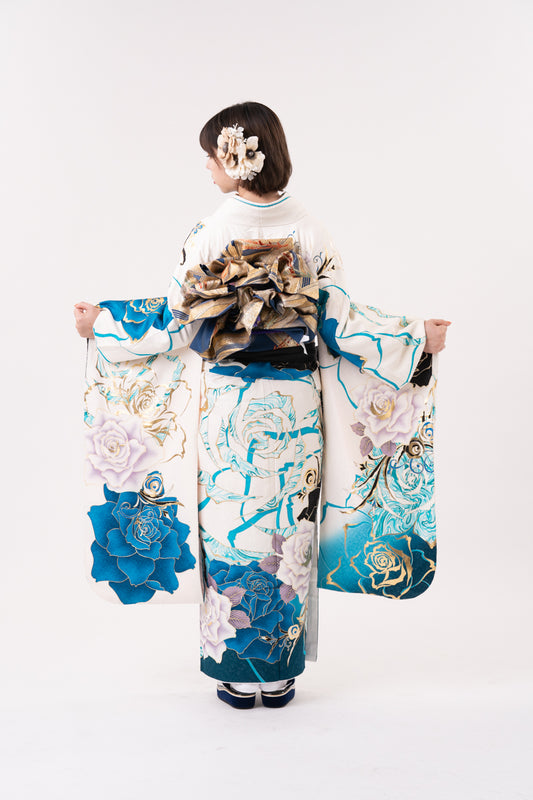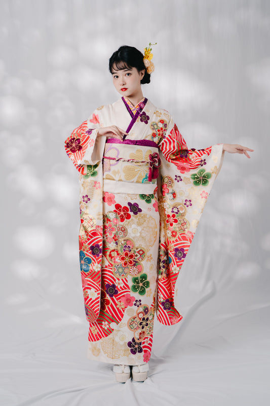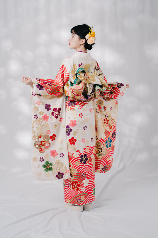 売り切れ白地 ねじり梅 正絹振袖【388】