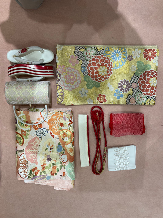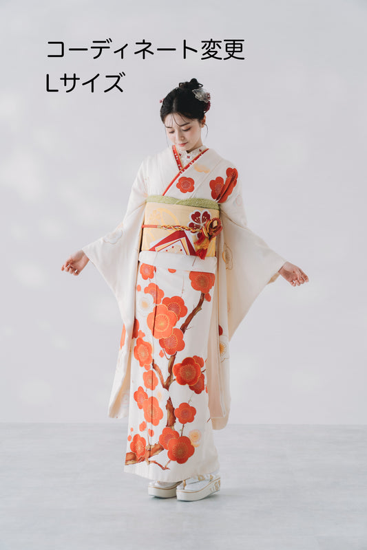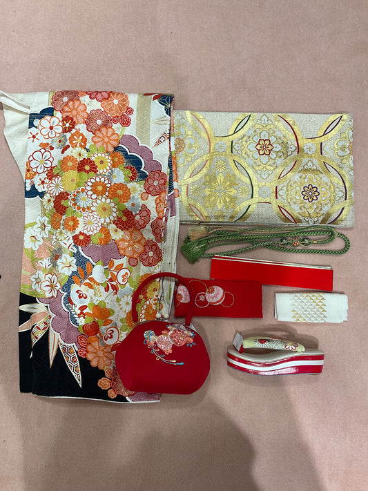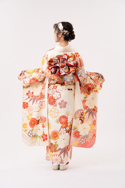 売り切れクリーム色オレンジ花 振袖 【8-18】