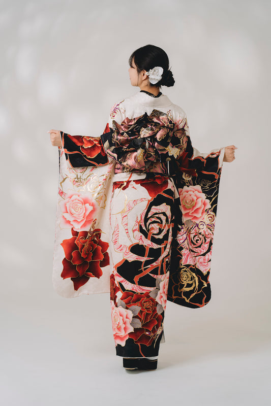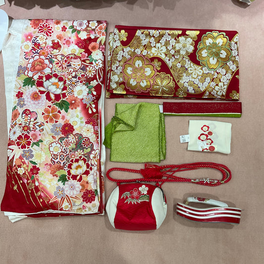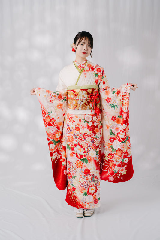 売り切れ白地裾赤 牡丹 桜 正絹振袖【469】