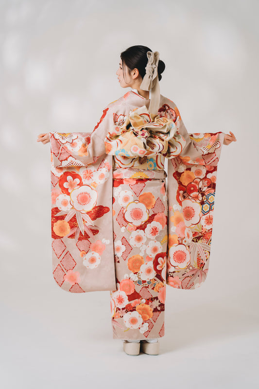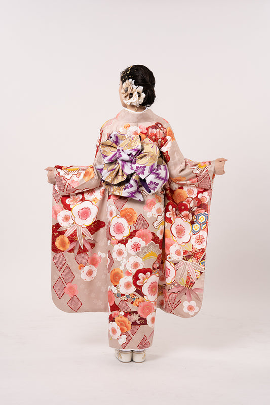 売り切れピンクベージュ 梅柄 正絹振袖【286】