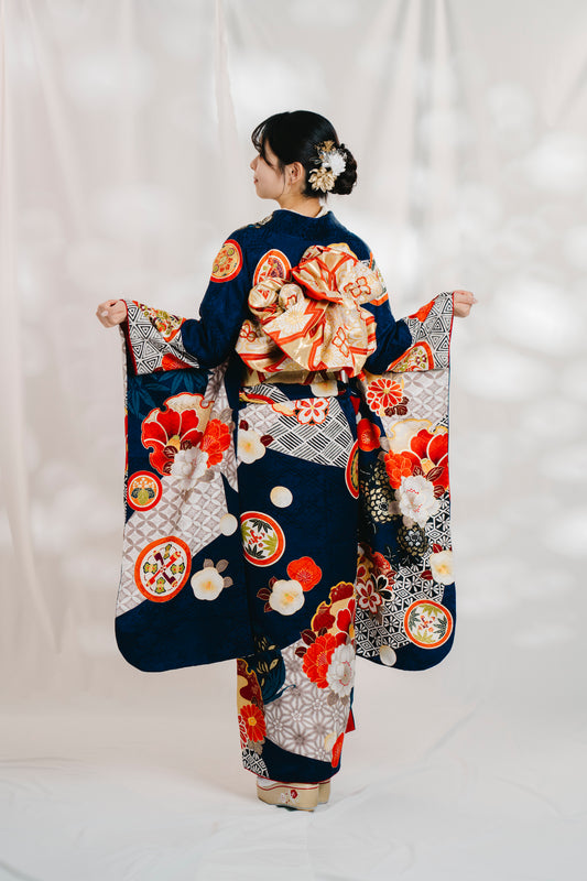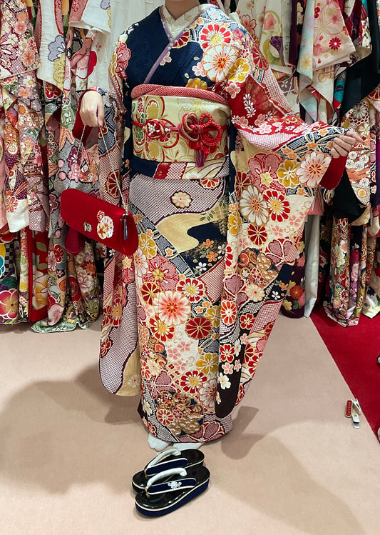 売り切れ紺 相良刺繍 正絹振袖【1008】