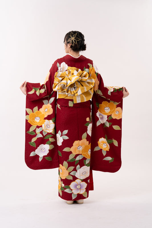 エンジ 桜・菊・牡丹 小花柄古典 正絹振袖【809】