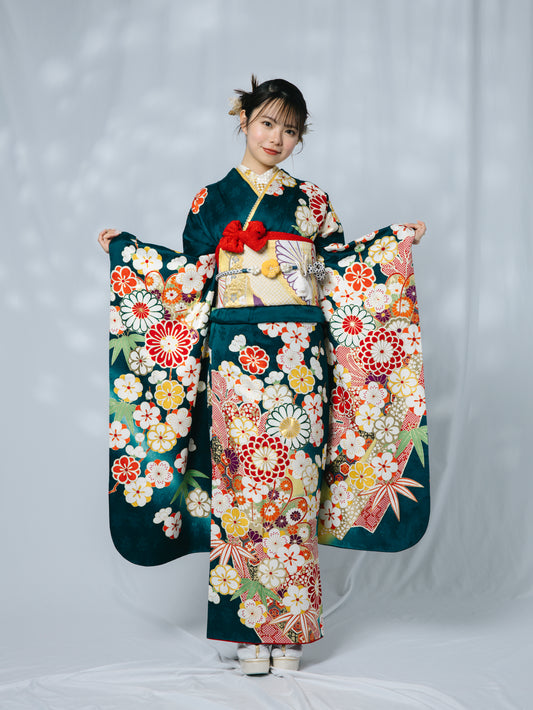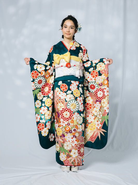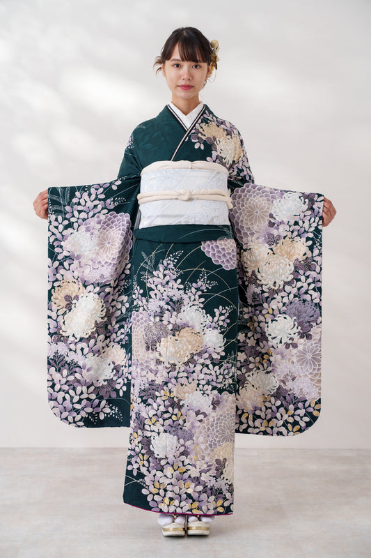 深緑地 菊 正絹振袖【592 】