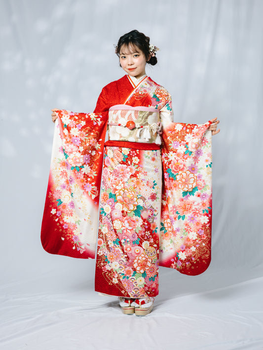 赤地 牡丹 正絹振袖【587】