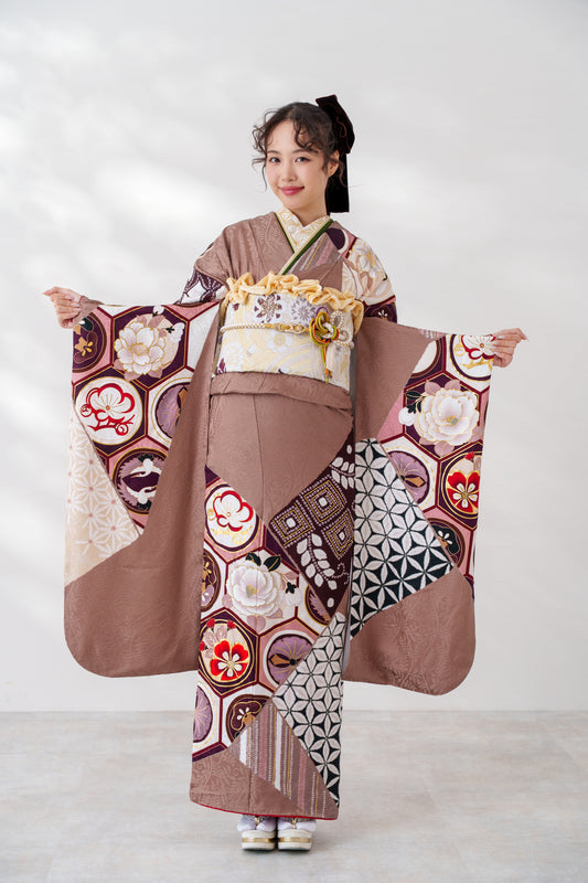 ブラウン 亀甲柄 正絹振袖【618】