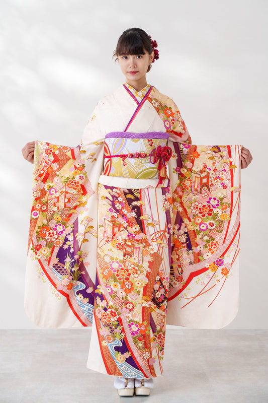 クリーム地 菊 正絹振袖 【446】