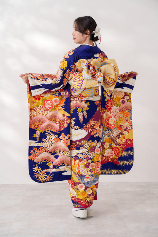紺地 牡丹 正絹振袖【657】