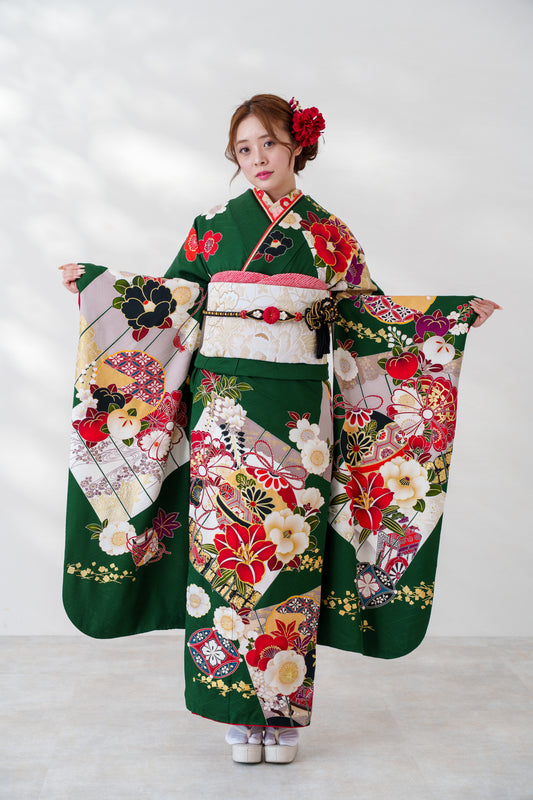 深緑 百合 正絹振袖【627】