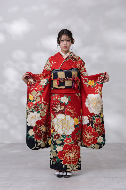 赤地 椿 正絹振袖【939】