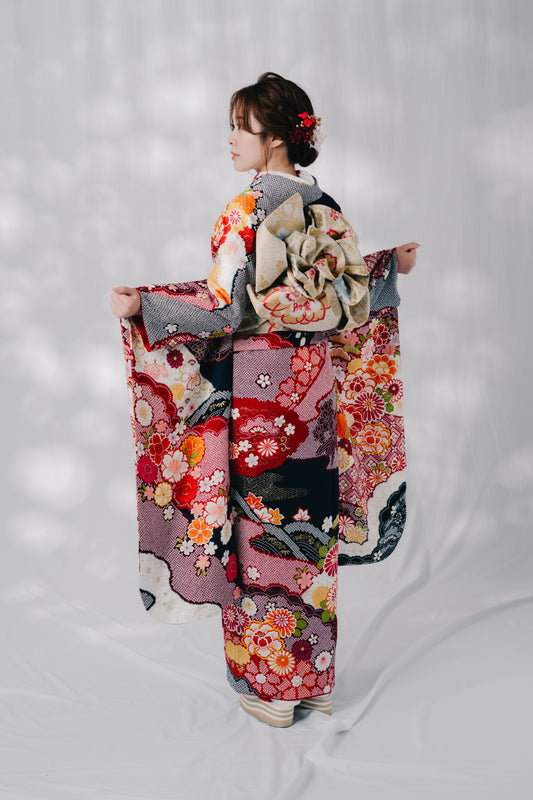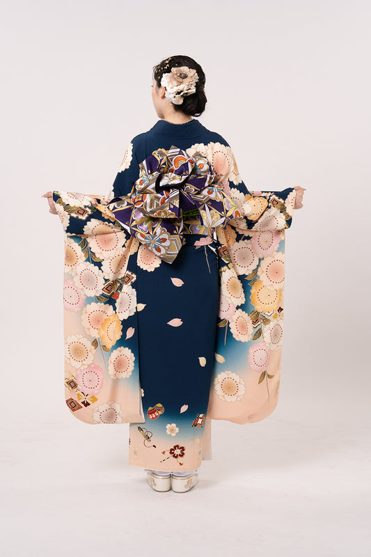 Sold out紺絞り 相良刺繍牡丹 正絹振袖【425】