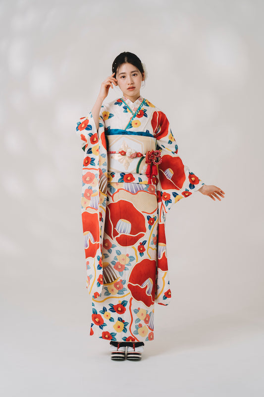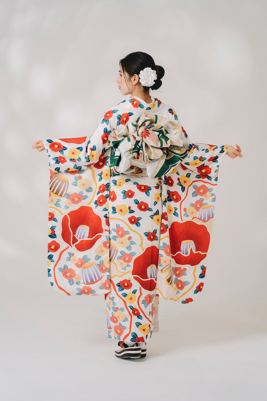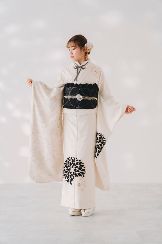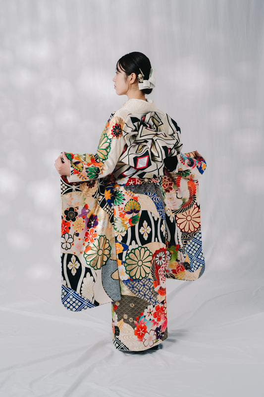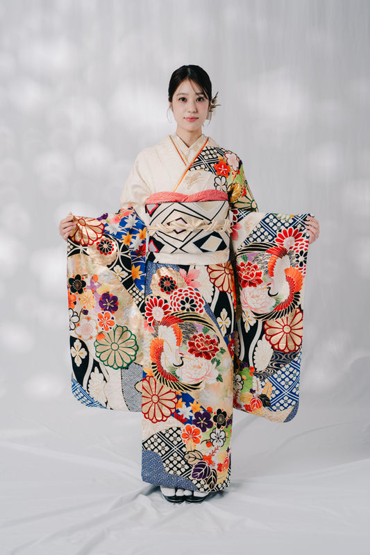 Sold out白地 慶長 鶴に牡丹 正絹振袖【386】