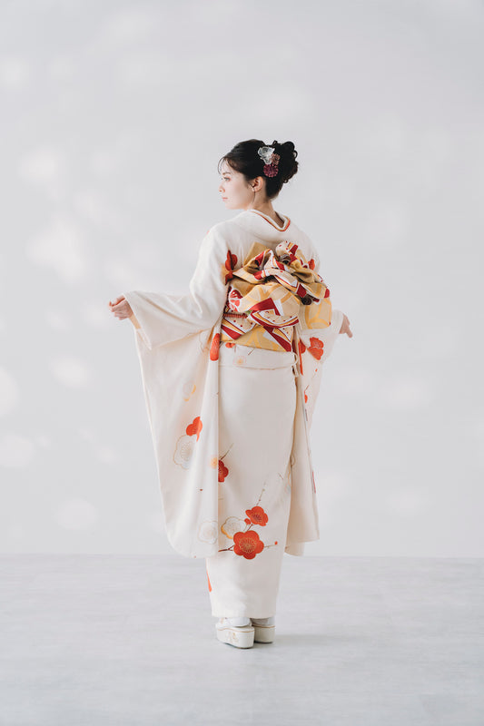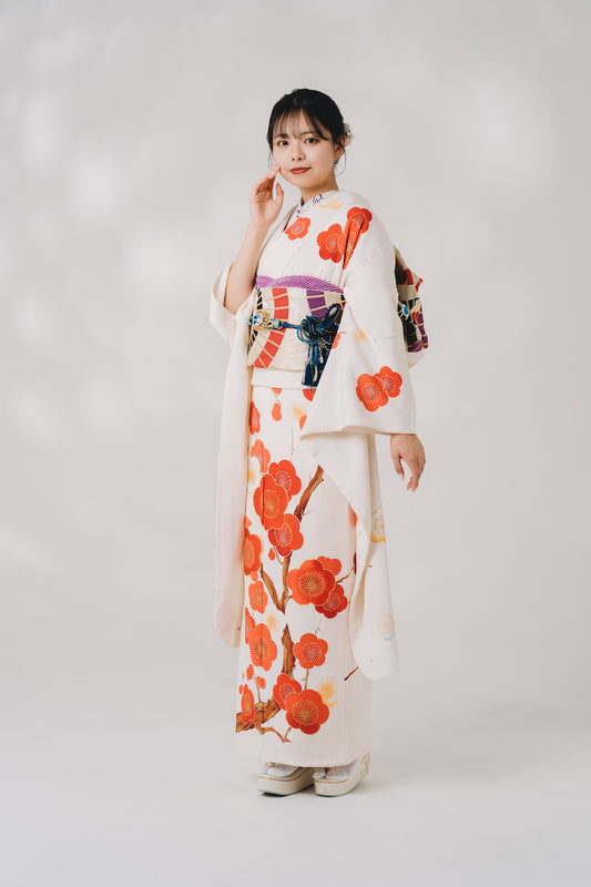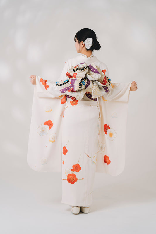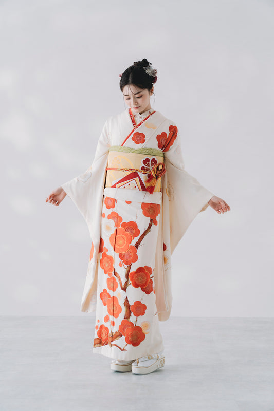Sold out白地ちりめん 手描きの梅柄 正絹振袖【242】