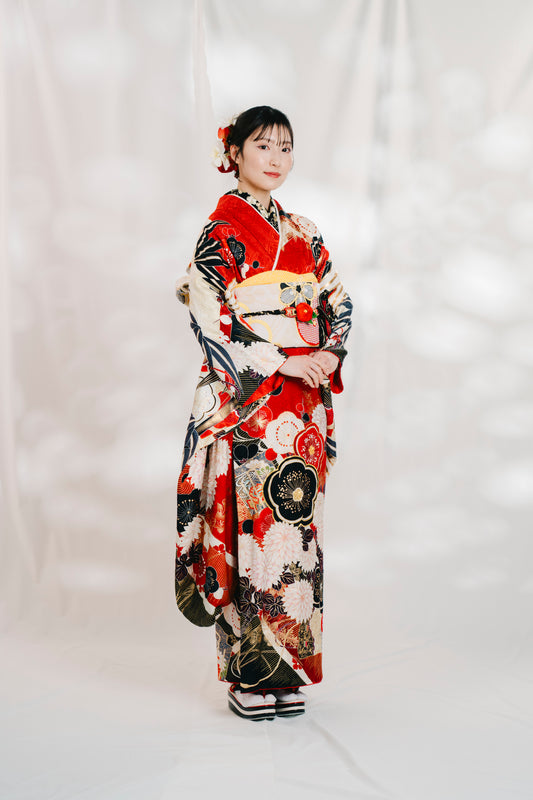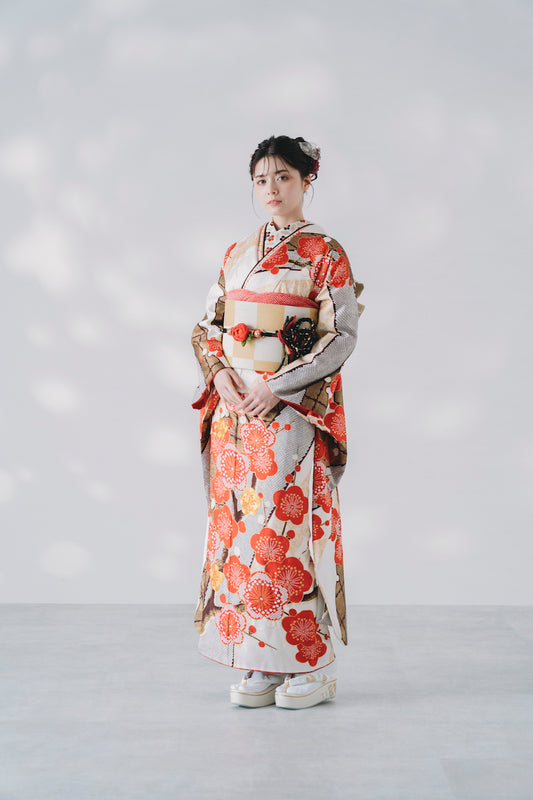 Sold out白地 鹿の子と梅柄 正絹振袖【246】