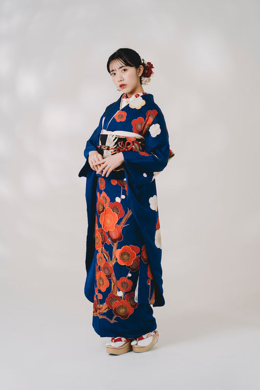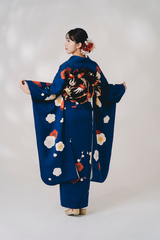 Sold out紺地 手描き古典柄 正絹振袖【279】