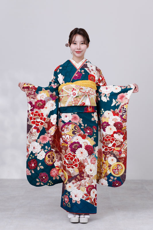 緑地 赤菊・白椿 鞠 正絹振袖【850】
