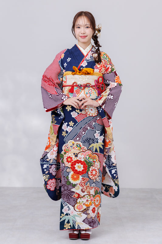紺地 丸菊・ねじり梅 正絹振袖【821】