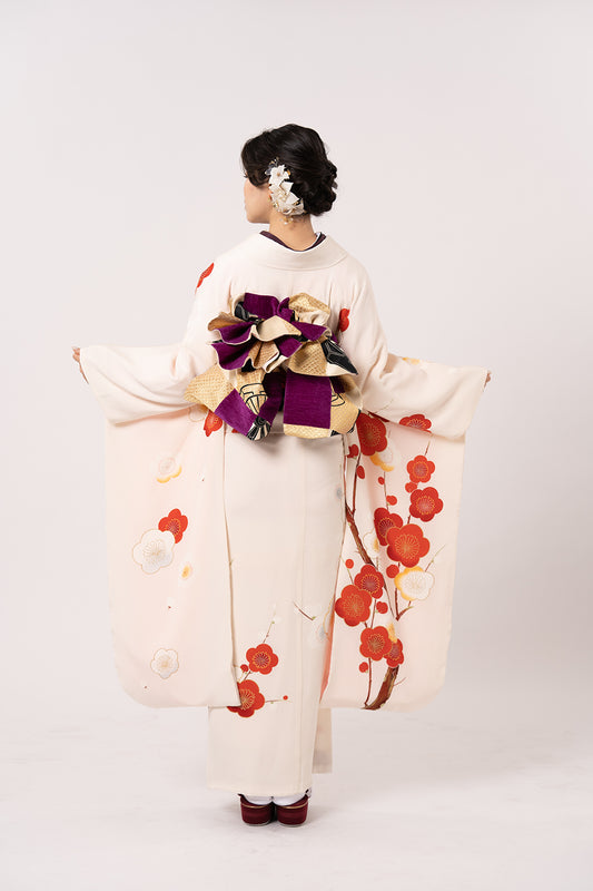 白地手描き梅柄 振袖【089】