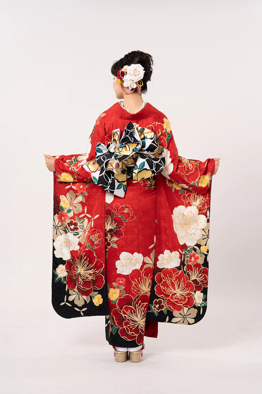 赤地大輪椿柄 振袖【080】