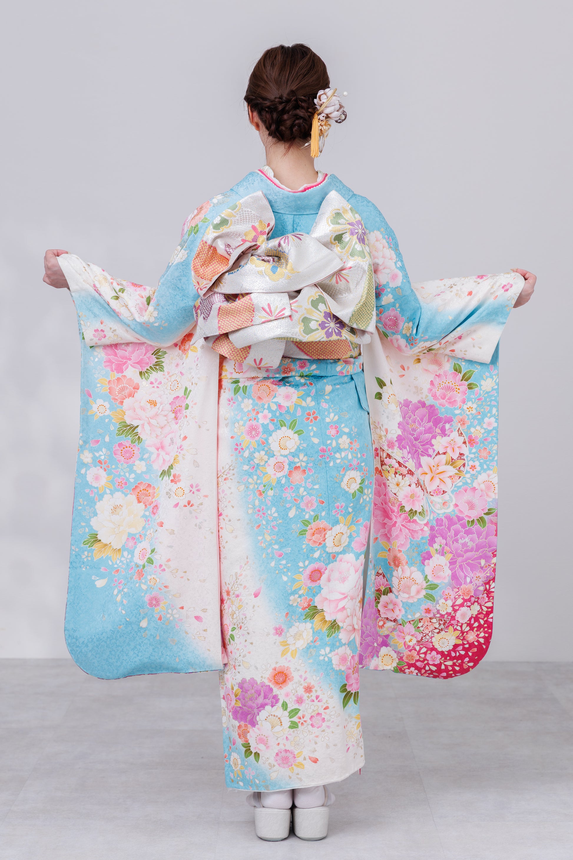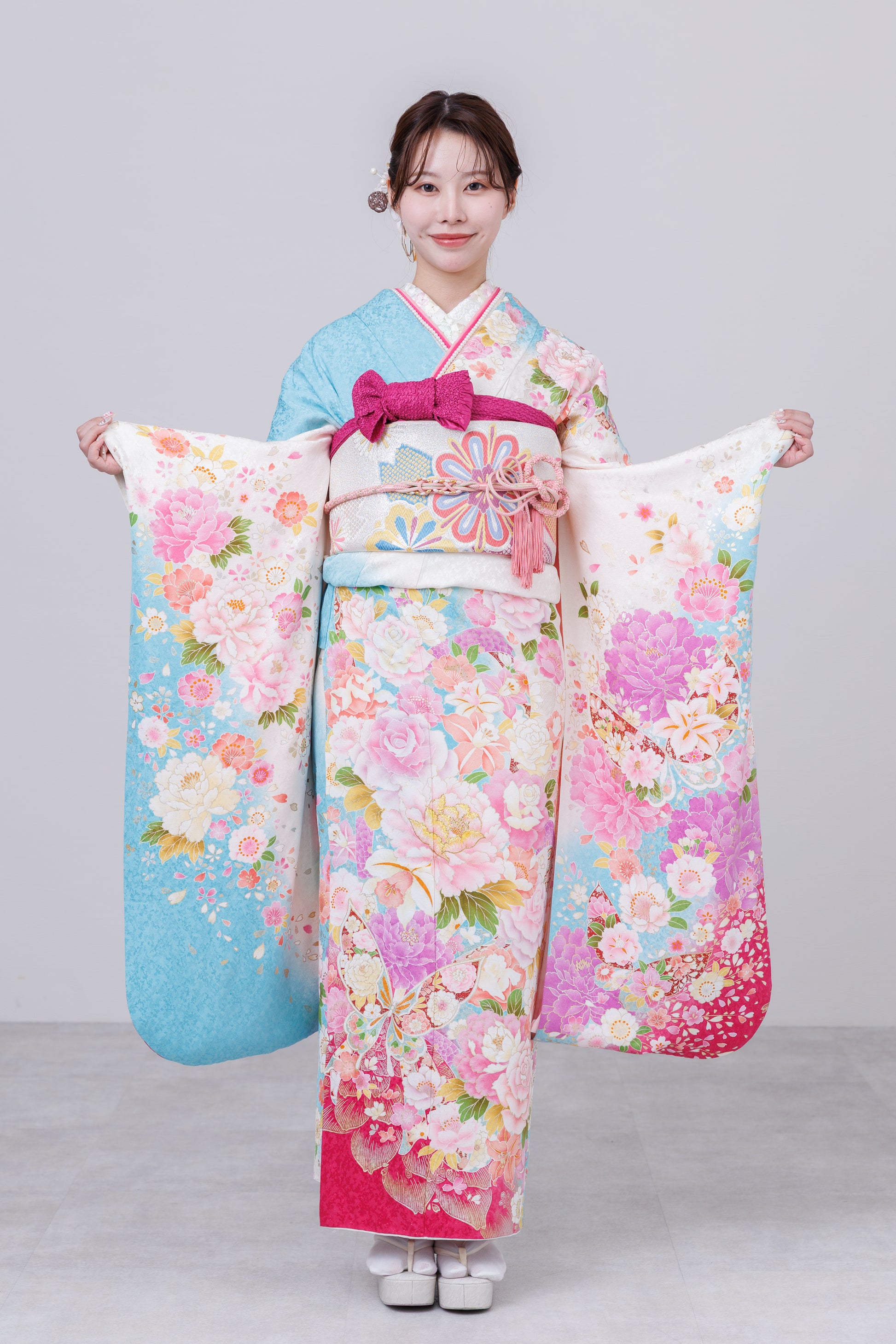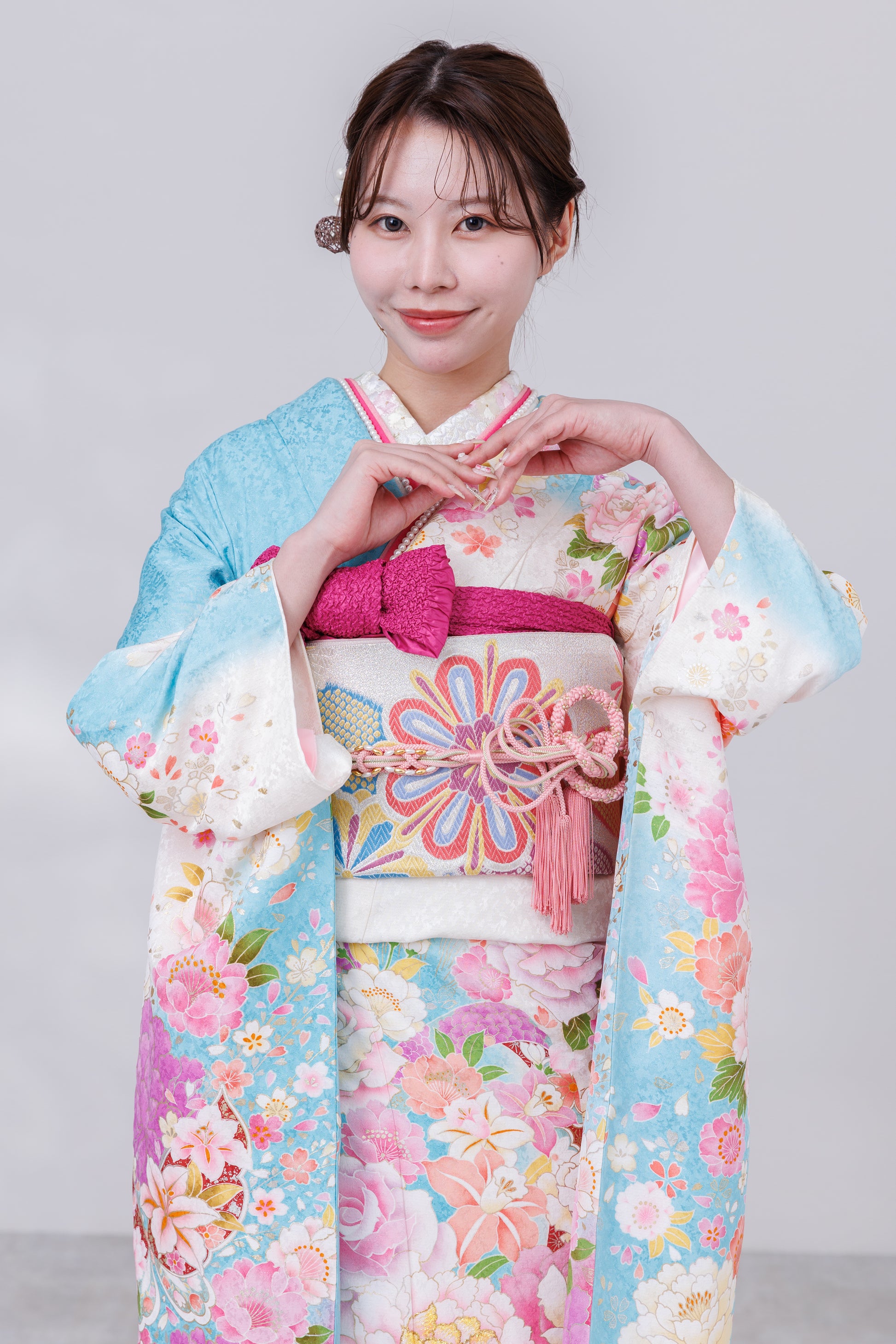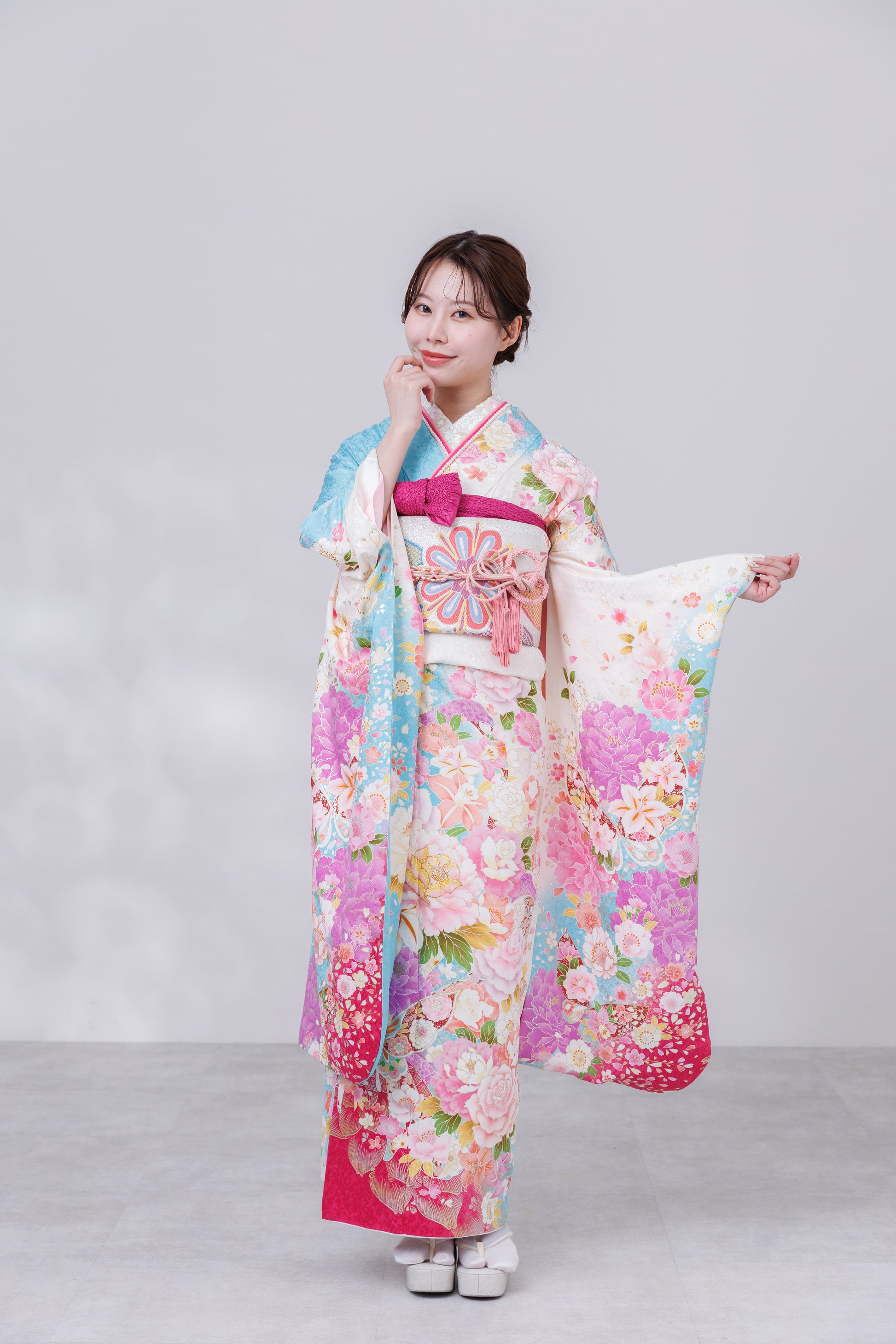牡丹や桜が振袖いっぱいに咲き誇り、華やかさが際立ちます。