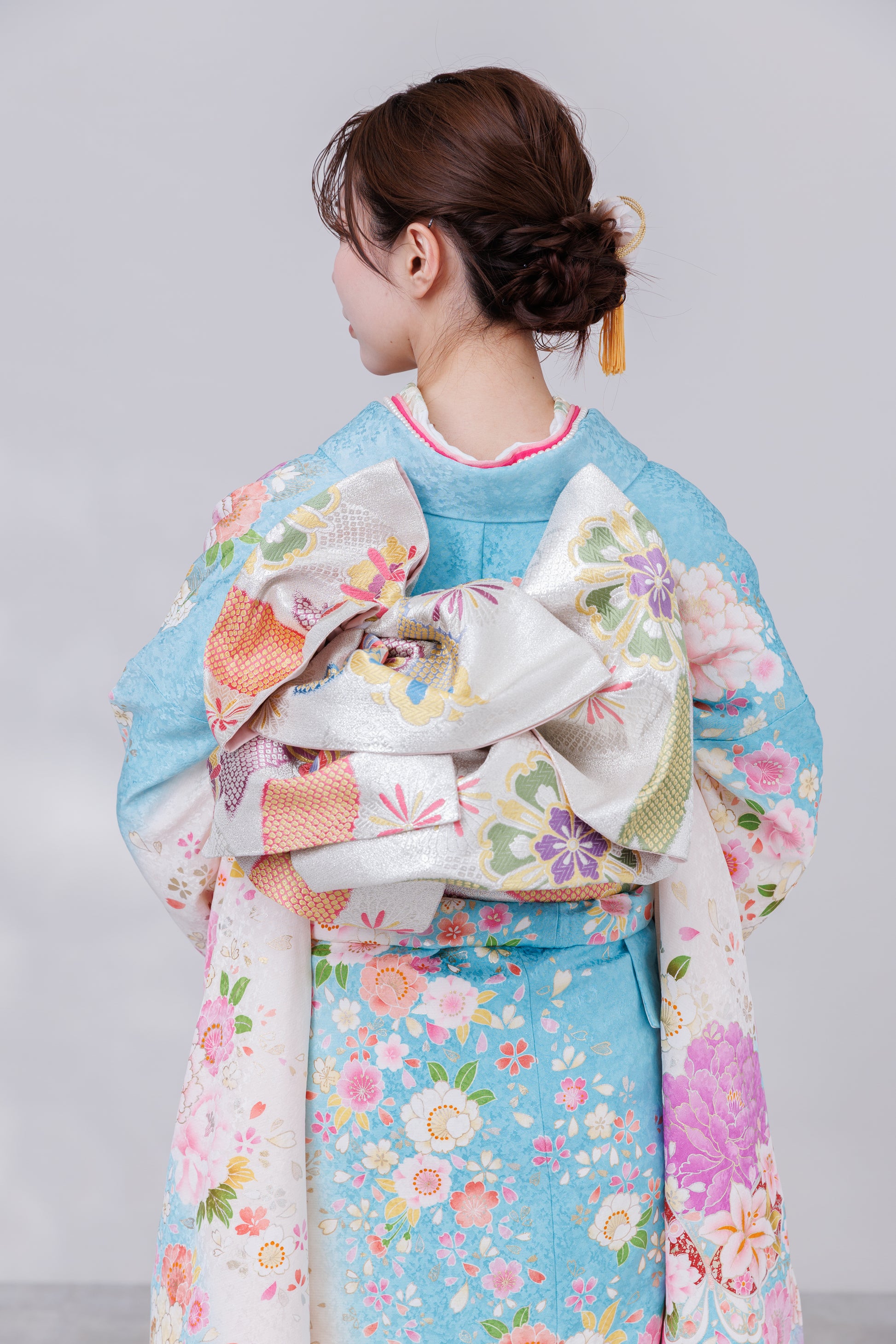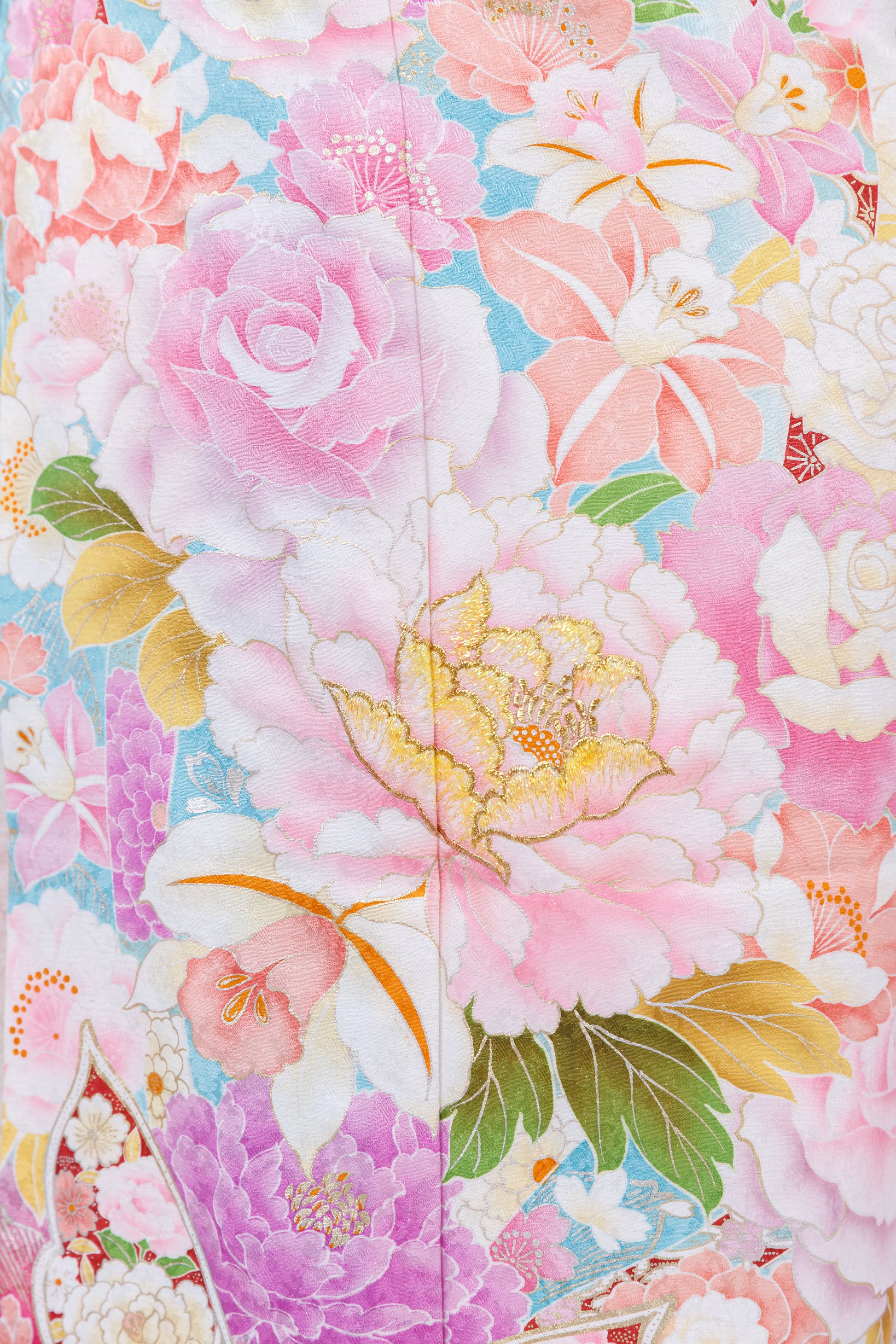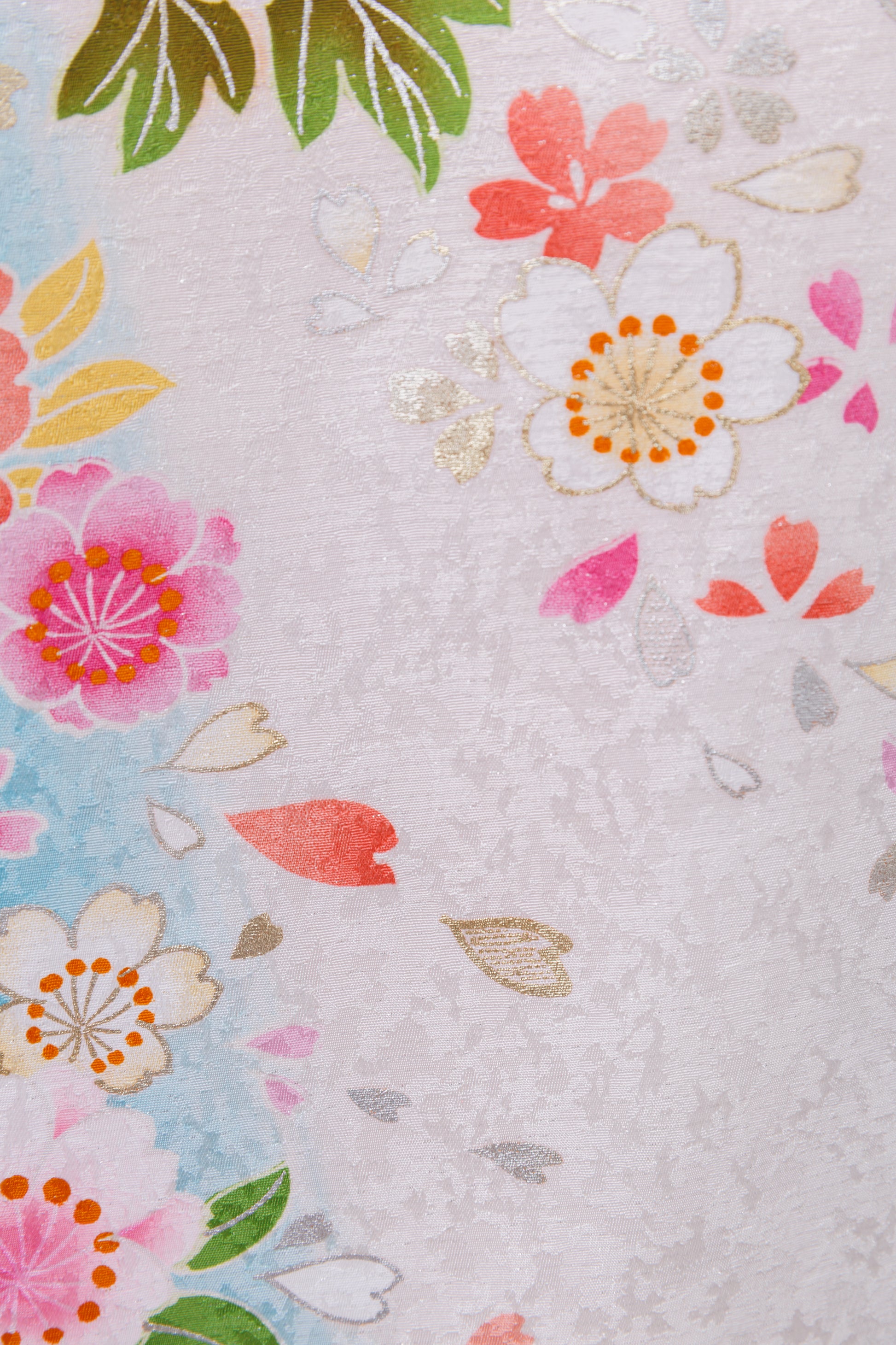水色・白・ピンクが溶け合う可憐な地色が、可憐で上品な雰囲気をまとう一着。